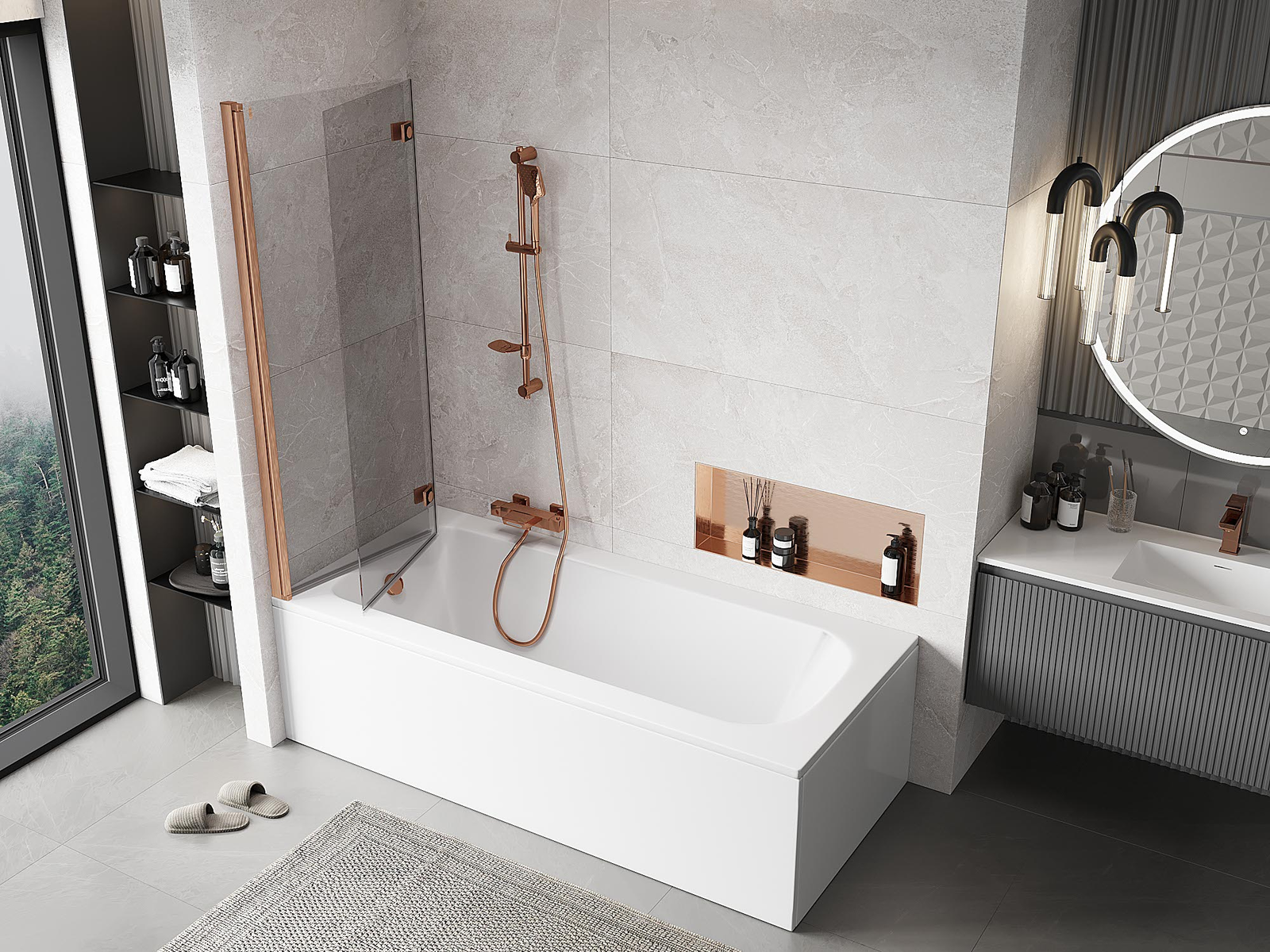 Protección efectiva contra el derrame de agua durante el baño. La mampara tiene juntas que se ajustan perfectamente a la superficie del vidrio y al borde de la bañera. Solución funcional que garantiza seguridad y facilidad de limpieza.