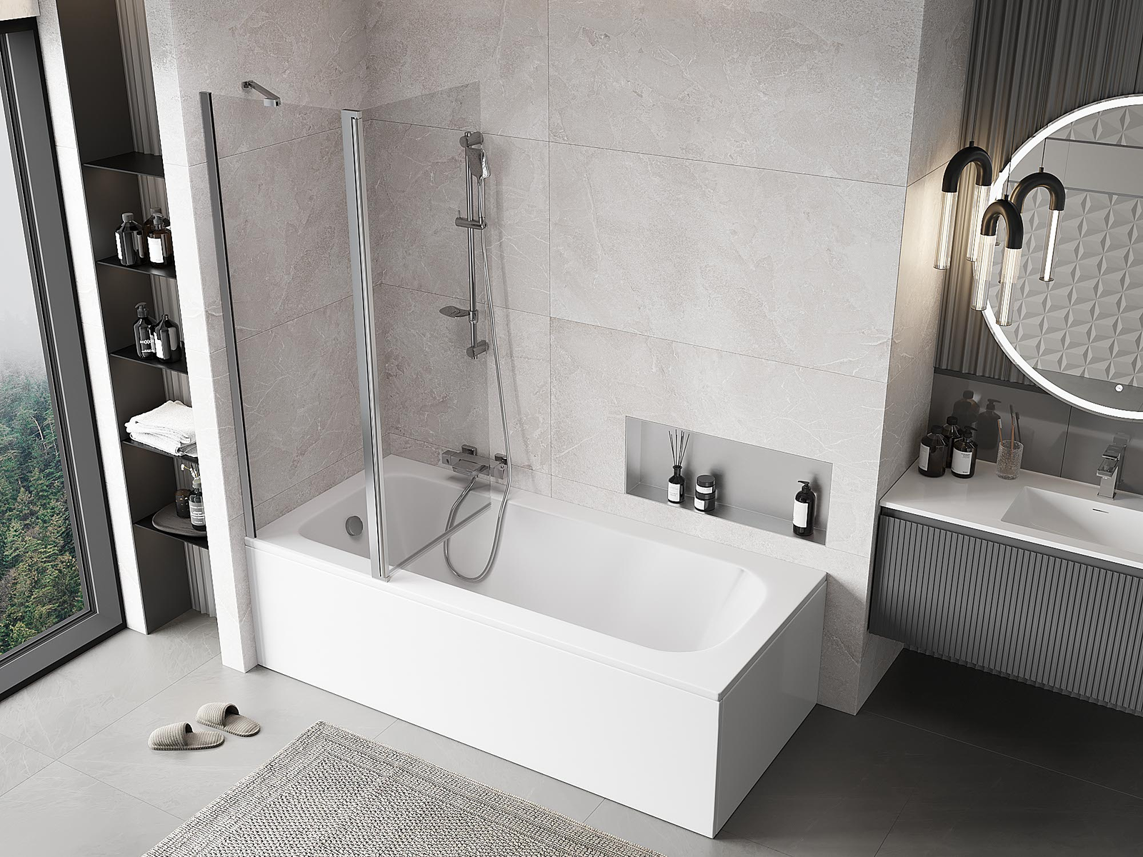 Protección efectiva contra el derrame de agua durante el baño. La mampara tiene juntas que se ajustan perfectamente a la superficie del vidrio y al borde de la bañera. Solución funcional que garantiza seguridad y facilidad de limpieza.