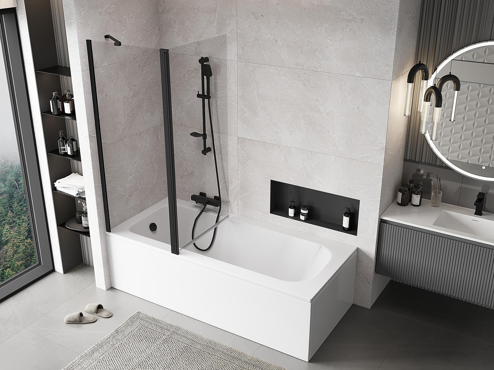 Protección efectiva contra el derrame de agua durante el baño. La mampara tiene juntas que se ajustan perfectamente a la superficie del vidrio y al borde de la bañera. Solución funcional que garantiza seguridad y facilidad de limpieza.