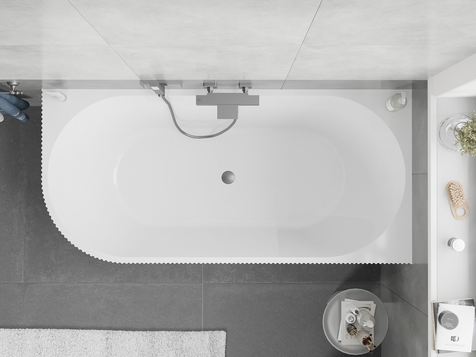 Mexen Silo bañera exenta de esquina derecha estriada 150 x 75 cm, blanca/gris, rebosadero gris pistola cepillado