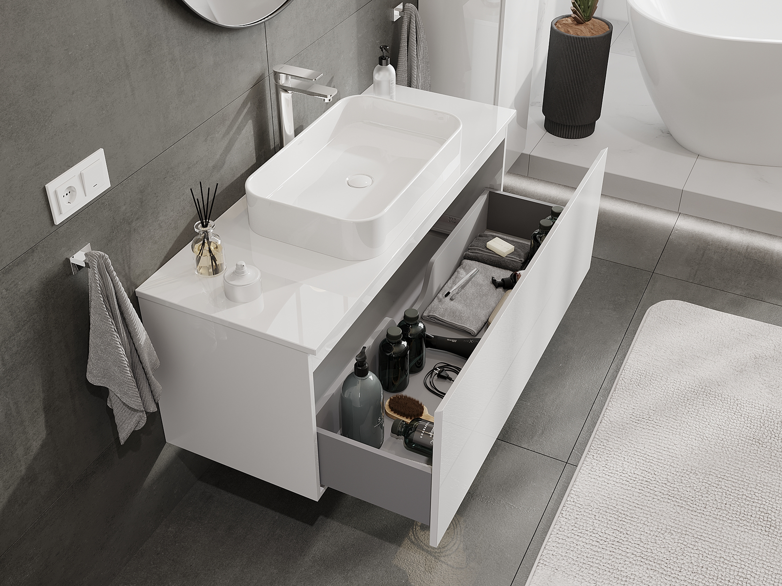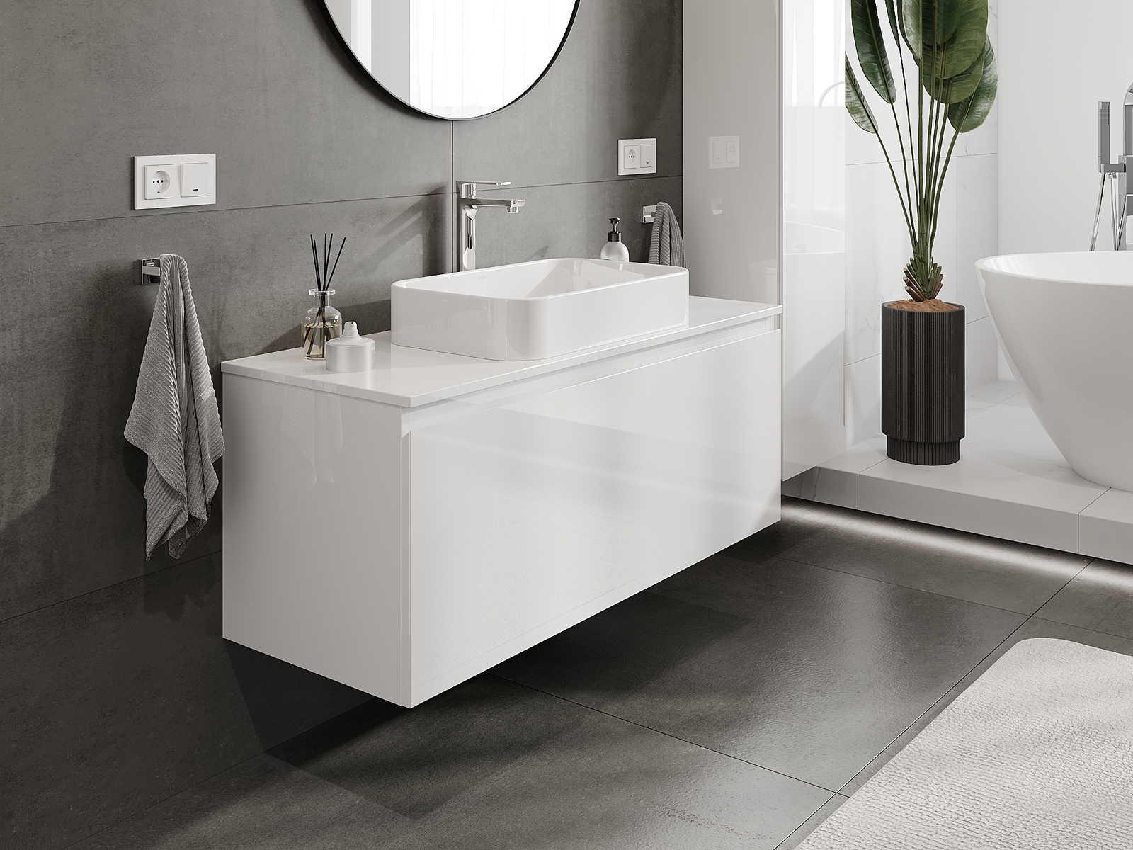 Nuestros muebles de baño modulares se pueden combinar en diferentes configuraciones de color, lo que permite una personalización completa. Se puede elegir tanto el aspecto como las funciones de los distintos elementos, lo que permite adaptar los muebles a las propias preferencias estilísticas y de uso.