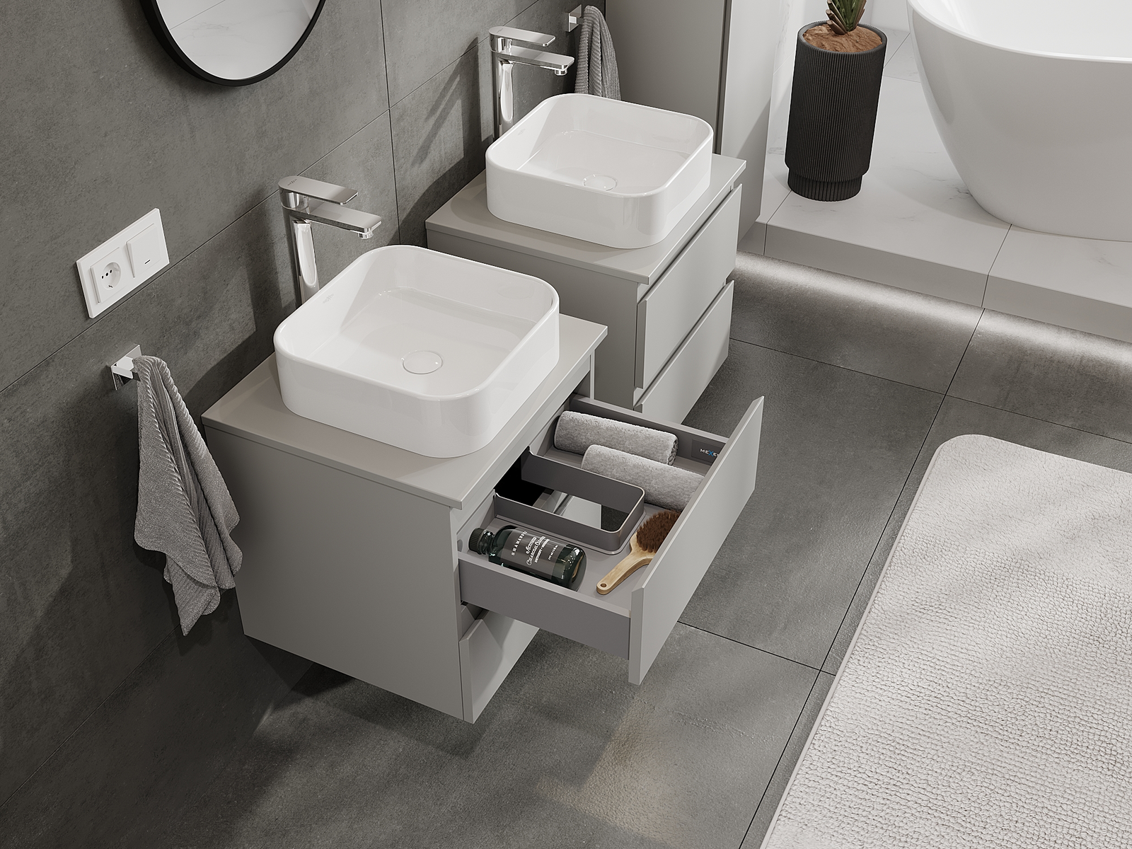 Nuestros muebles de baño modulares se pueden combinar en diferentes configuraciones de color, lo que permite una personalización completa. Se puede elegir tanto el aspecto como las funciones de los distintos elementos, lo que permite adaptar los muebles a las propias preferencias estilísticas y de uso.