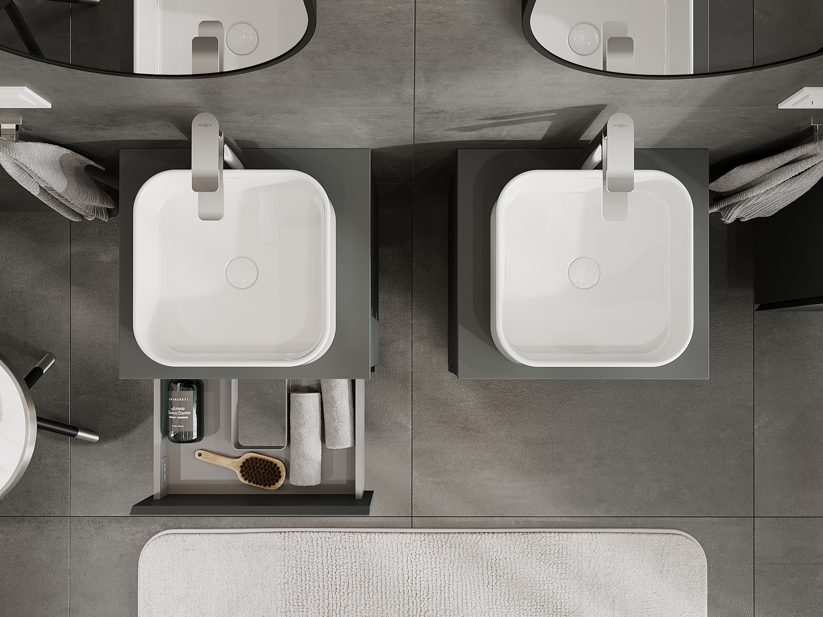 Nuestros muebles de baño modulares se pueden combinar en diferentes configuraciones de color, lo que permite una personalización completa. Se puede elegir tanto el aspecto como las funciones de los distintos elementos, lo que permite adaptar los muebles a las propias preferencias estilísticas y de uso.