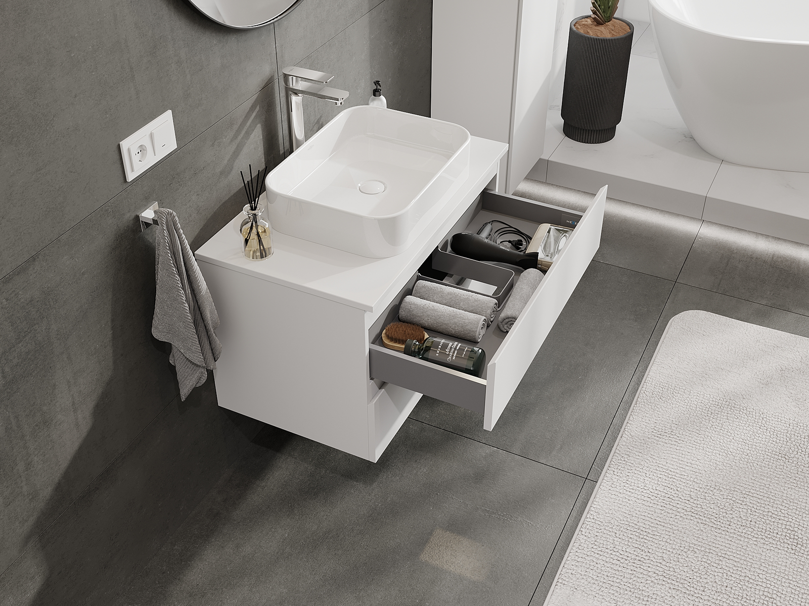 Nuestros muebles de baño modulares se pueden combinar en diferentes configuraciones de color, lo que permite una personalización completa. Se puede elegir tanto el aspecto como las funciones de los distintos elementos, lo que permite adaptar los muebles a las propias preferencias estilísticas y de uso.