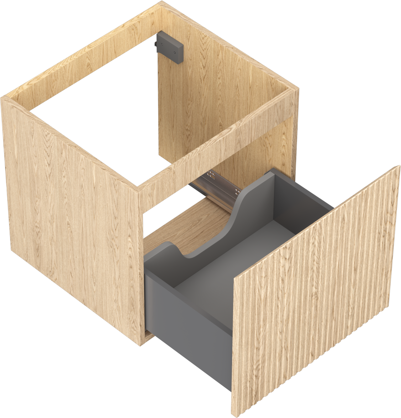 El corte en el cajón está diseñado de tal manera que pueda alojar el sifón, que es necesario en las instalaciones de lavabos. Gracias a esto, el mueble puede ser montado de manera completamente funcional, sin la necesidad de renunciar al espacio en el cajón en favor de la instalación.