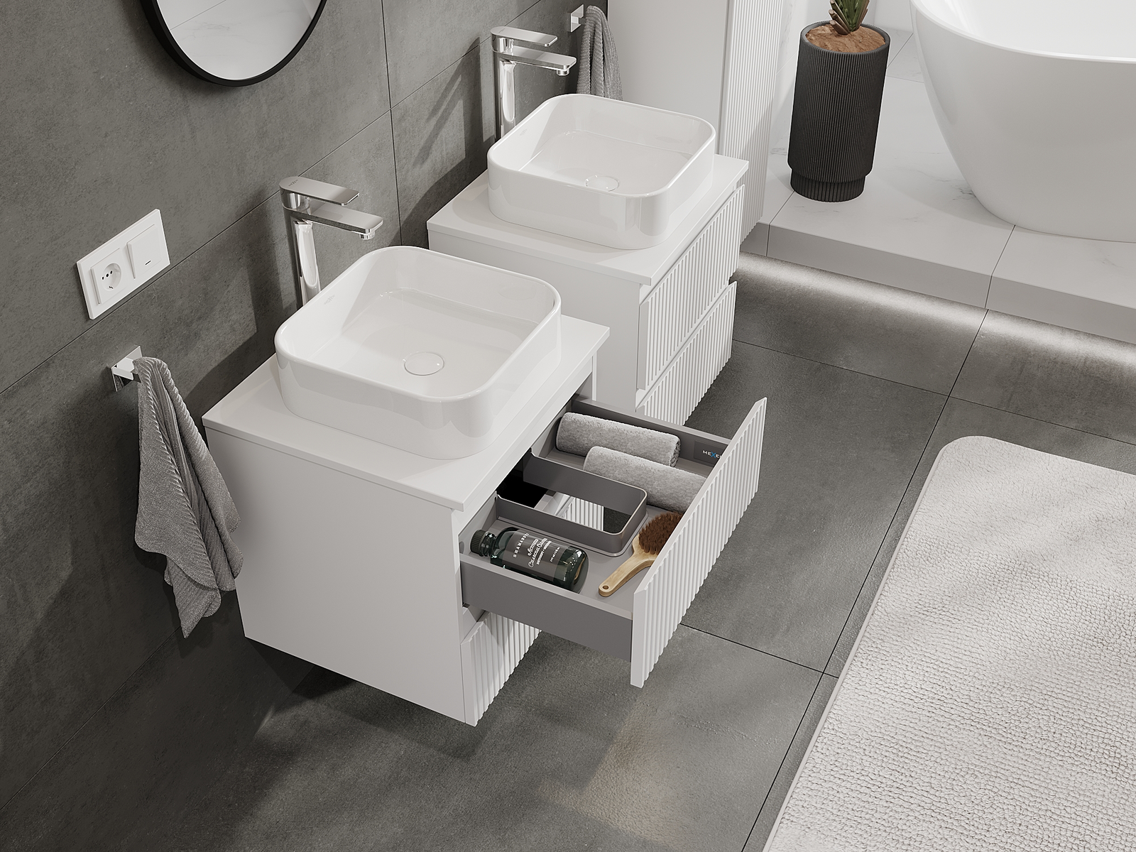 Nuestros muebles de baño modulares se pueden combinar en diferentes configuraciones de color, lo que permite una personalización completa. Se puede elegir tanto el aspecto como las funciones de los distintos elementos, lo que permite adaptar los muebles a las propias preferencias estilísticas y de uso.