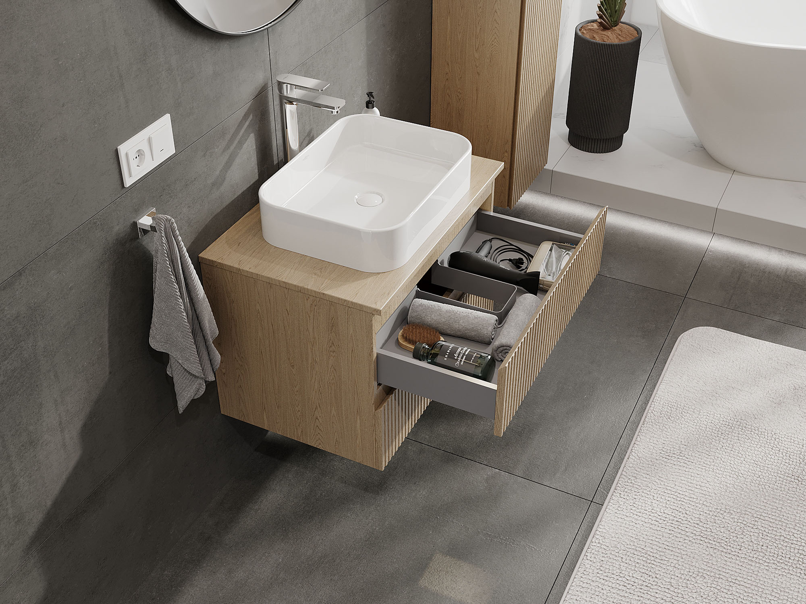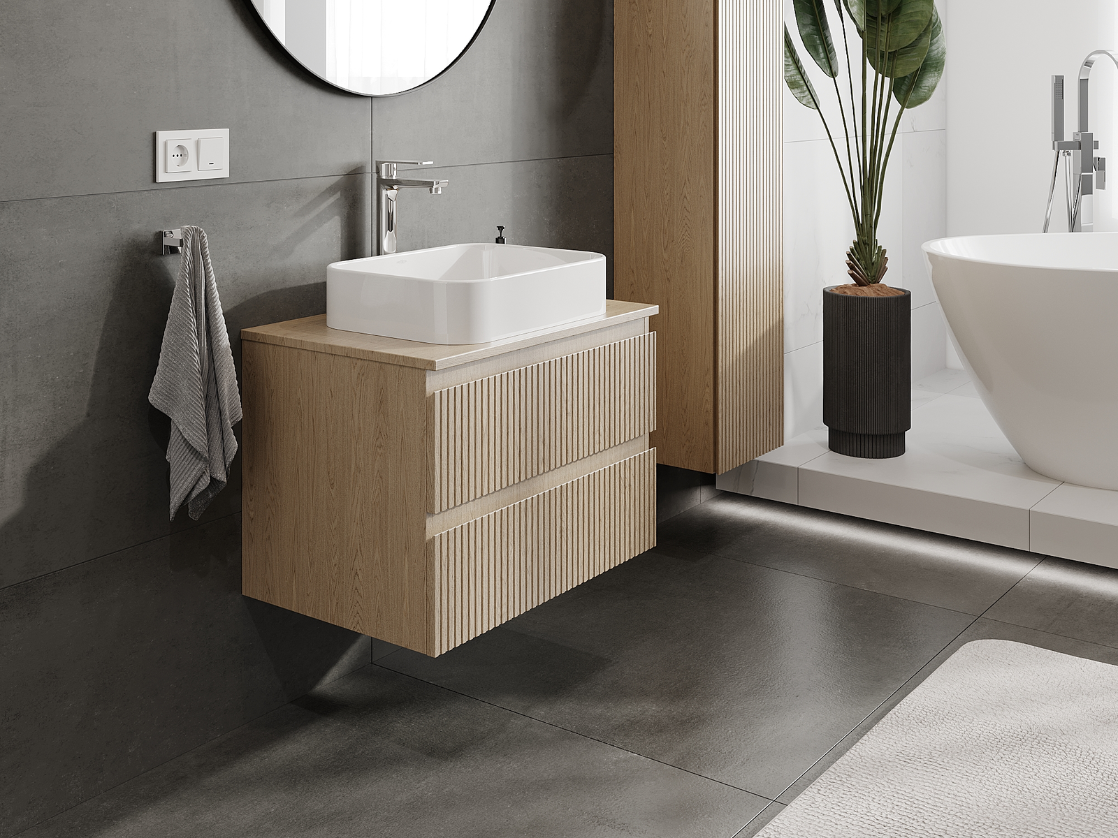 El cuerpo del gabinete se entrega completamente ensamblado, lo que significa máxima comodidad y ahorro de tiempo. No tienes que pasar horas ensamblando el mueble, solo necesitas instalarlo en el lugar elegido en el baño. Es la solución ideal para personas que valoran un montaje rápido y un efecto inmediato.