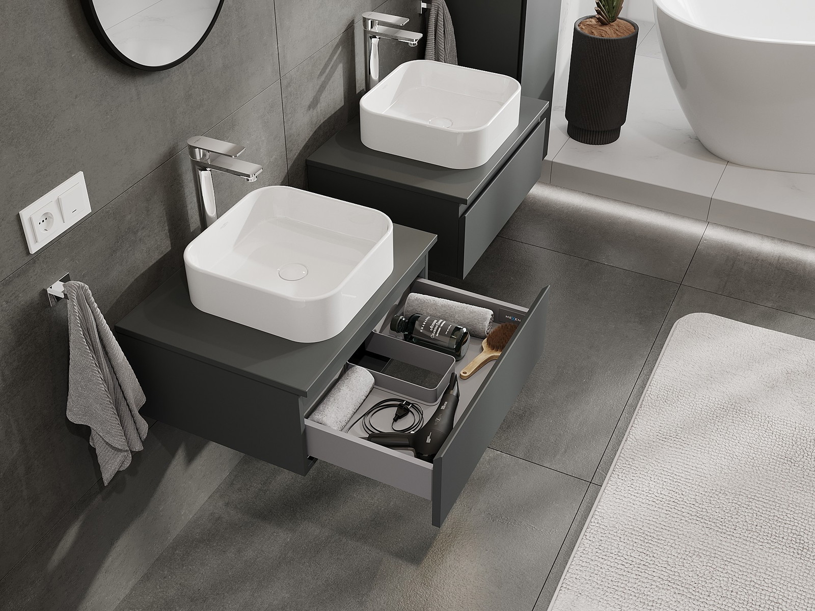 Nuestros muebles de baño modulares se pueden combinar en diferentes configuraciones de color, lo que permite una personalización completa. Se puede elegir tanto el aspecto como las funciones de los distintos elementos, lo que permite adaptar los muebles a las propias preferencias estilísticas y de uso.