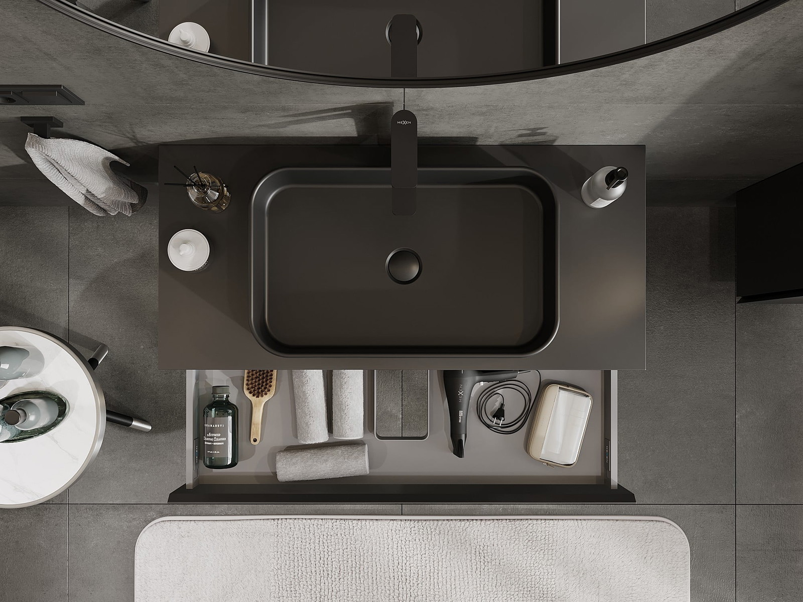 El corte en el cajón está diseñado de tal manera que pueda alojar el sifón, que es necesario en las instalaciones de lavabos. Gracias a esto, el mueble puede ser montado de manera completamente funcional, sin la necesidad de renunciar al espacio en el cajón en favor de la instalación.