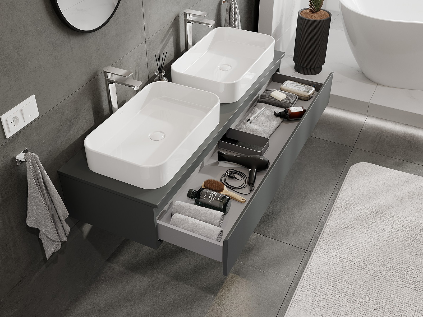 Nuestros muebles de baño modulares se pueden combinar en diferentes configuraciones de color, lo que permite una personalización completa. Se puede elegir tanto el aspecto como las funciones de los distintos elementos, lo que permite adaptar los muebles a las propias preferencias estilísticas y de uso.