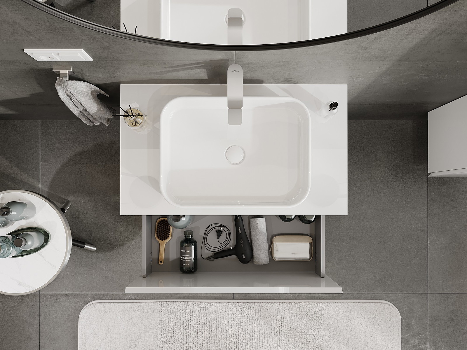 El corte en el cajón está diseñado de tal manera que pueda alojar el sifón, que es necesario en las instalaciones de lavabos. Gracias a esto, el mueble puede ser montado de manera completamente funcional, sin la necesidad de renunciar al espacio en el cajón en favor de la instalación.