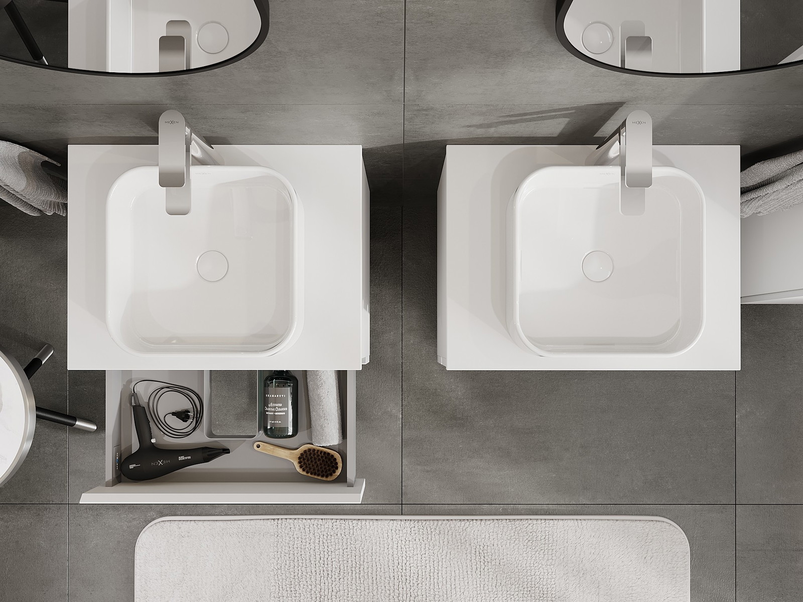 Nuestros muebles de baño modulares se pueden combinar en diferentes configuraciones de color, lo que permite una personalización completa. Se puede elegir tanto el aspecto como las funciones de los distintos elementos, lo que permite adaptar los muebles a las propias preferencias estilísticas y de uso.