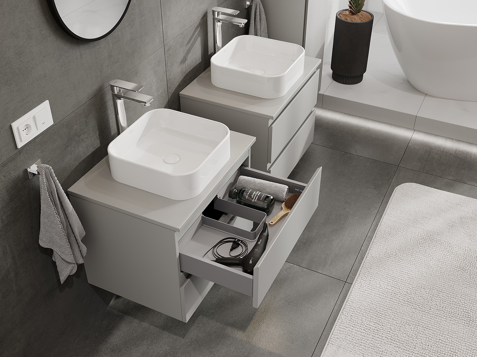 Nuestros muebles de baño modulares se pueden combinar en diferentes configuraciones de color, lo que permite una personalización completa. Se puede elegir tanto el aspecto como las funciones de los distintos elementos, lo que permite adaptar los muebles a las propias preferencias estilísticas y de uso.