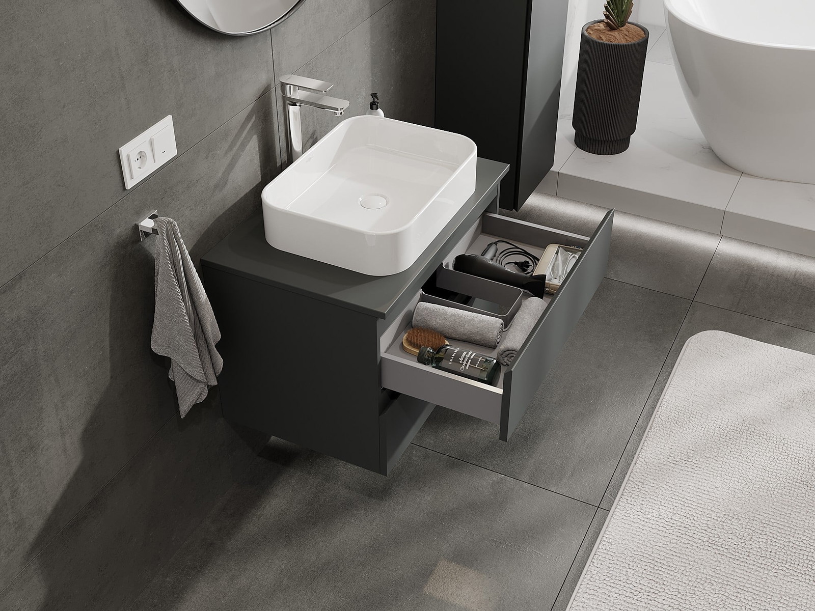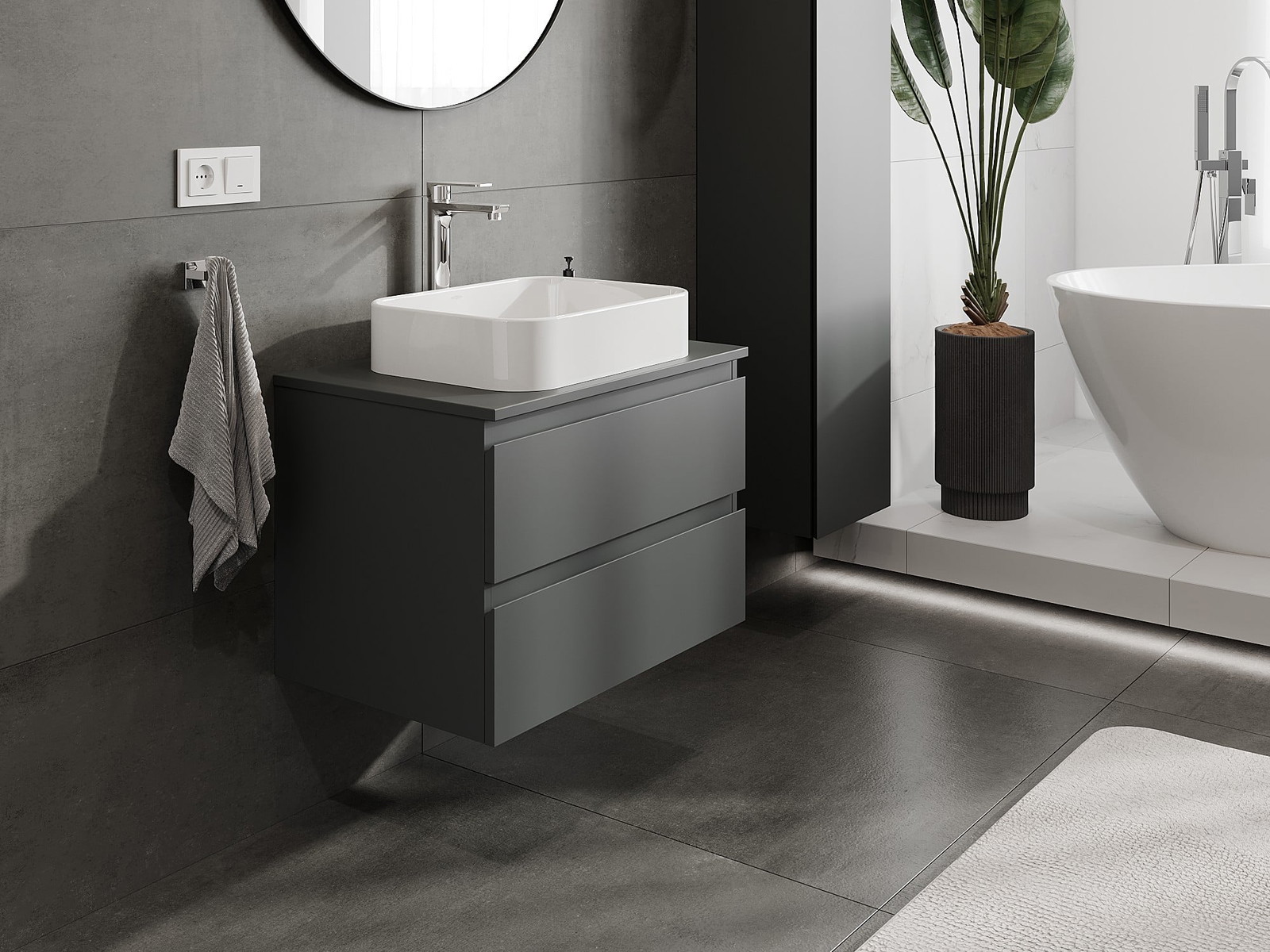 Nuestros muebles de baño modulares se pueden combinar en diferentes configuraciones de color, lo que permite una personalización completa. Se puede elegir tanto el aspecto como las funciones de los distintos elementos, lo que permite adaptar los muebles a las propias preferencias estilísticas y de uso.