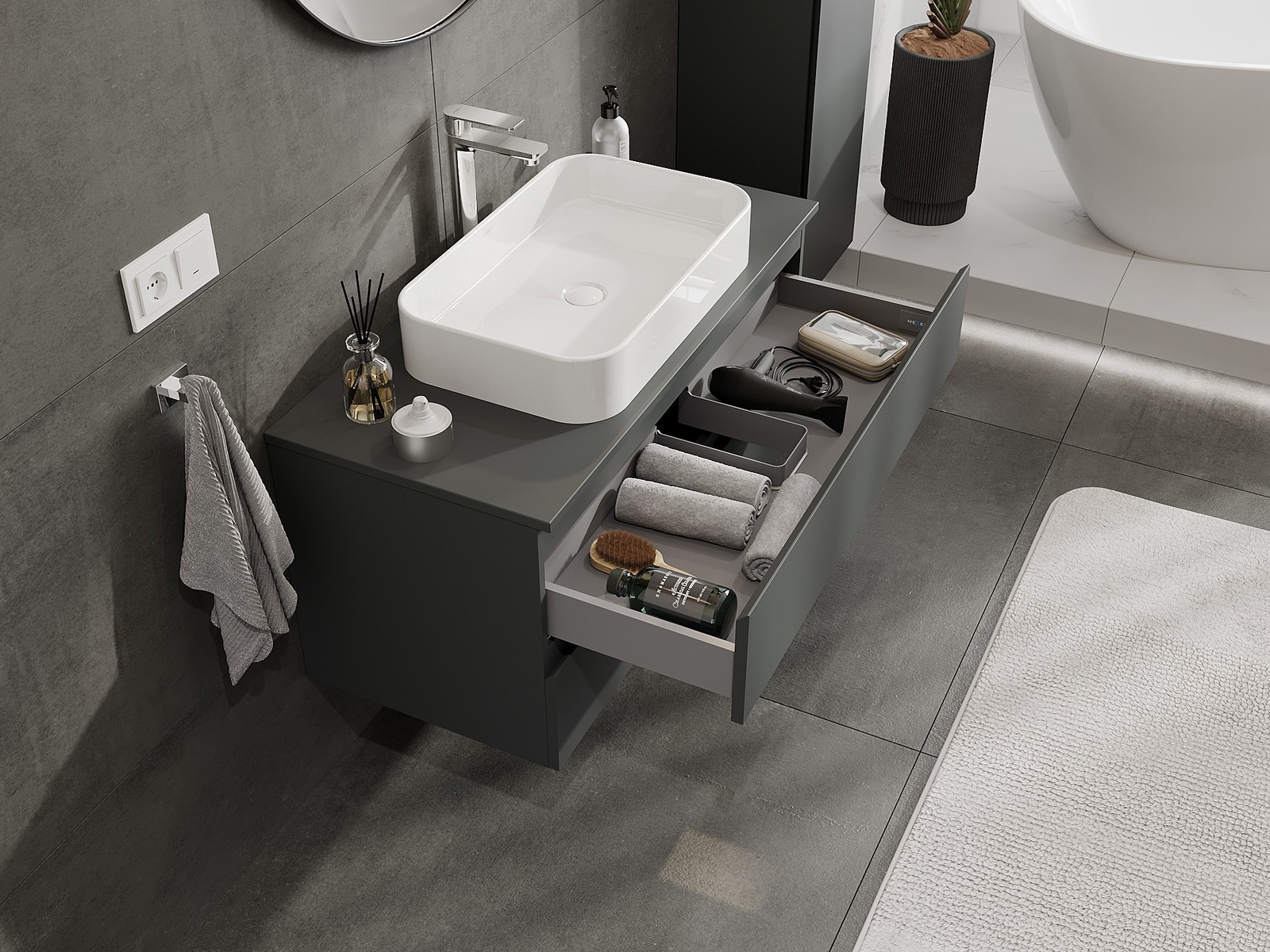 Nuestros muebles de baño modulares se pueden combinar en diferentes configuraciones de color, lo que permite una personalización completa. Se puede elegir tanto el aspecto como las funciones de los distintos elementos, lo que permite adaptar los muebles a las propias preferencias estilísticas y de uso.