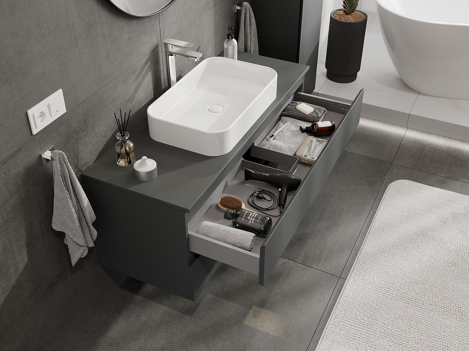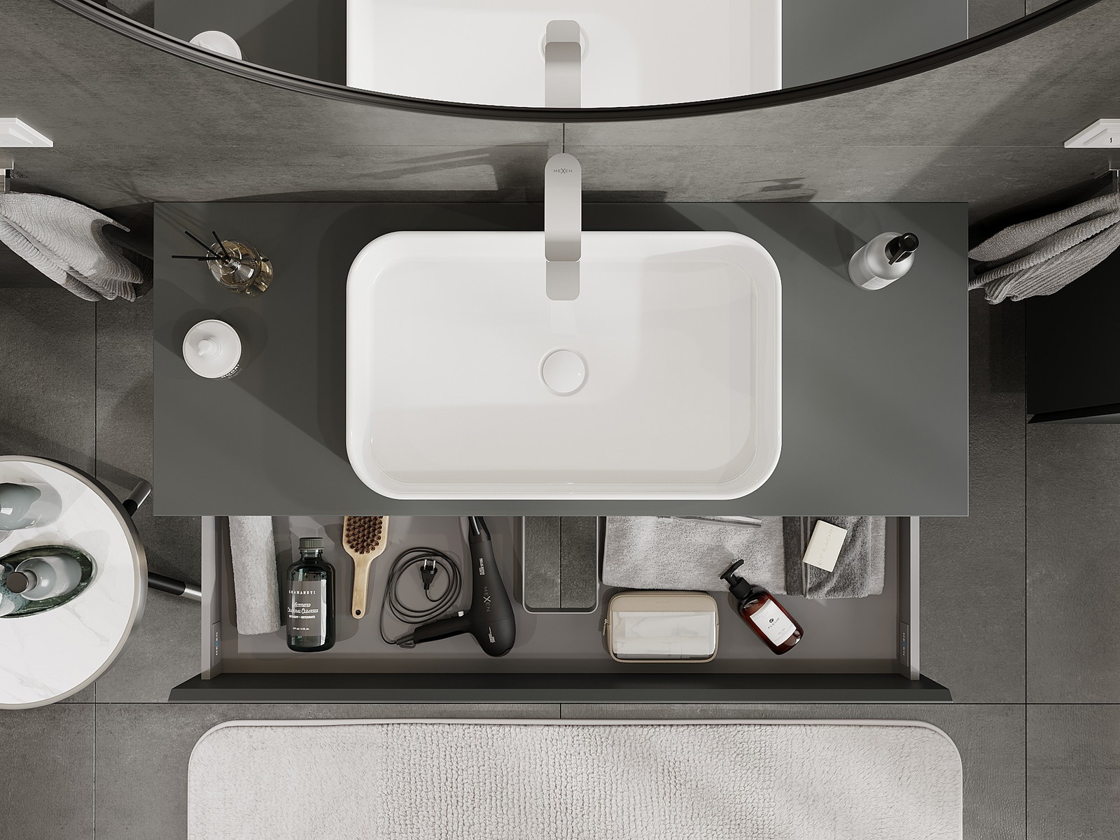 Nuestros muebles de baño modulares se pueden combinar en diferentes configuraciones de color, lo que permite una personalización completa. Se puede elegir tanto el aspecto como las funciones de los distintos elementos, lo que permite adaptar los muebles a las propias preferencias estilísticas y de uso.