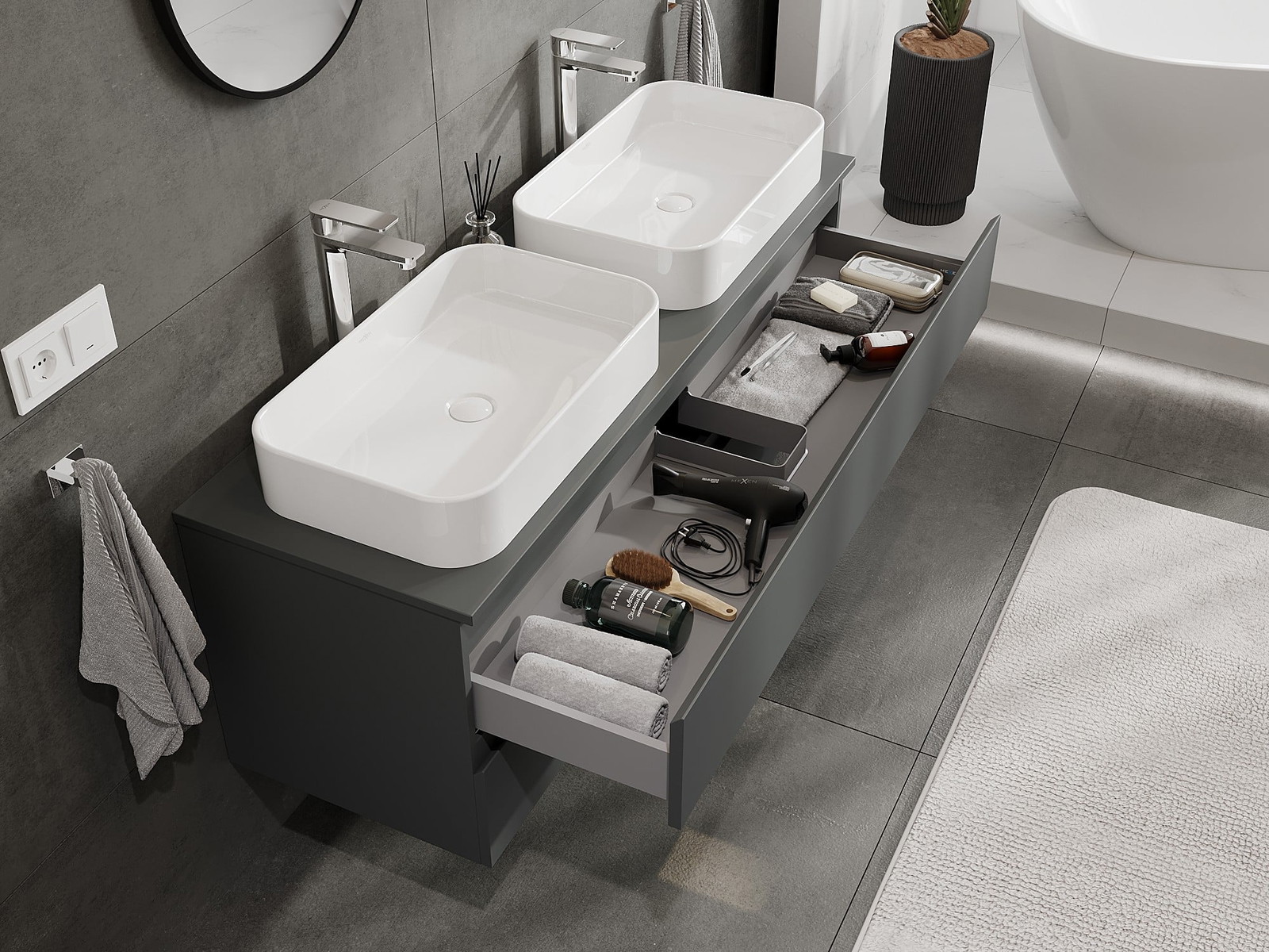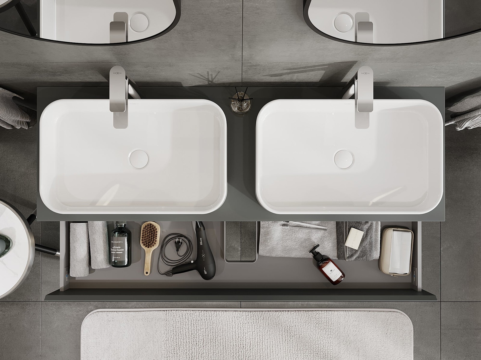 Nuestros muebles de baño modulares se pueden combinar en diferentes configuraciones de color, lo que permite una personalización completa. Se puede elegir tanto el aspecto como las funciones de los distintos elementos, lo que permite adaptar los muebles a las propias preferencias estilísticas y de uso.