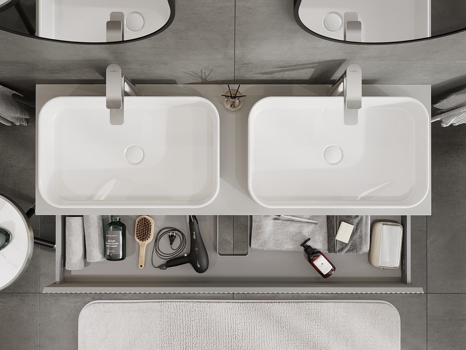 Nuestros muebles de baño modulares se pueden combinar en diferentes configuraciones de color, lo que permite una personalización completa. Se puede elegir tanto el aspecto como las funciones de los distintos elementos, lo que permite adaptar los muebles a las propias preferencias estilísticas y de uso.