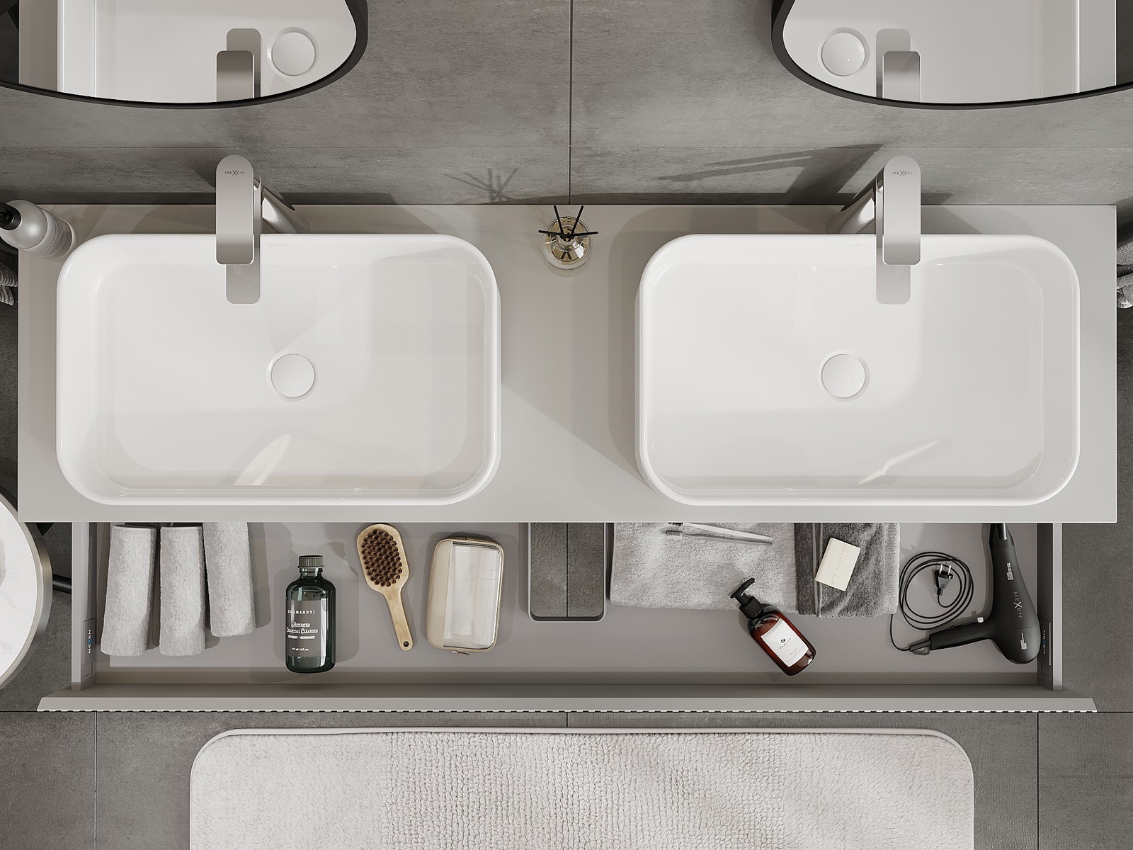 Nuestros muebles de baño modulares se pueden combinar en diferentes configuraciones de color, lo que permite una personalización completa. Se puede elegir tanto el aspecto como las funciones de los distintos elementos, lo que permite adaptar los muebles a las propias preferencias estilísticas y de uso.