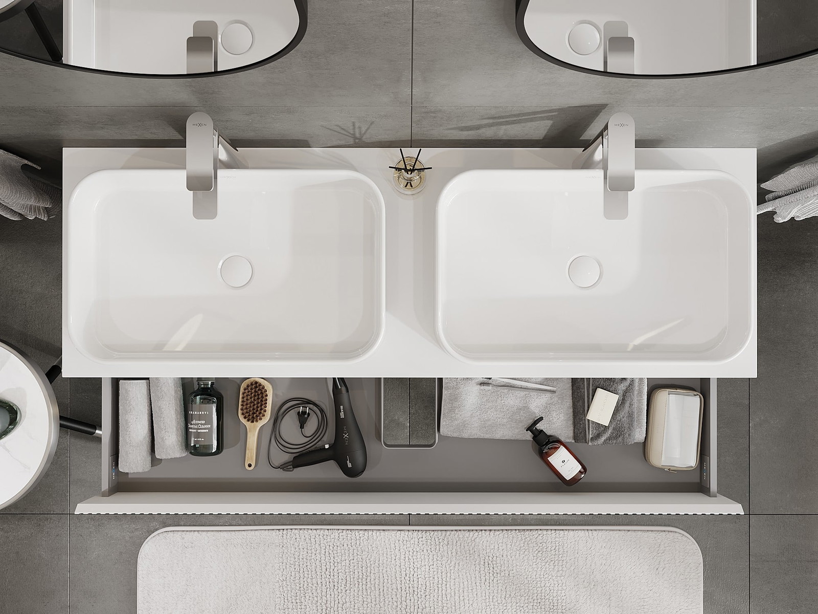 Nuestros muebles de baño modulares se pueden combinar en diferentes configuraciones de color, lo que permite una personalización completa. Se puede elegir tanto el aspecto como las funciones de los distintos elementos, lo que permite adaptar los muebles a las propias preferencias estilísticas y de uso.