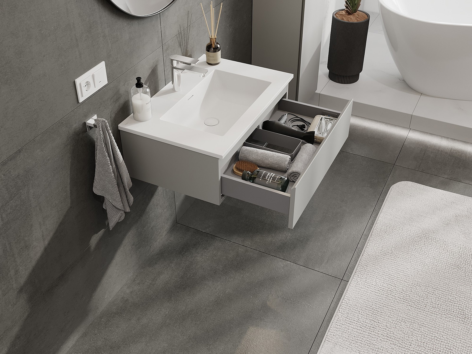 Nuestros muebles de baño modulares se pueden combinar en diferentes configuraciones de color, lo que permite una personalización completa. Se puede elegir tanto el aspecto como las funciones de los distintos elementos, lo que permite adaptar los muebles a las propias preferencias estilísticas y de uso.