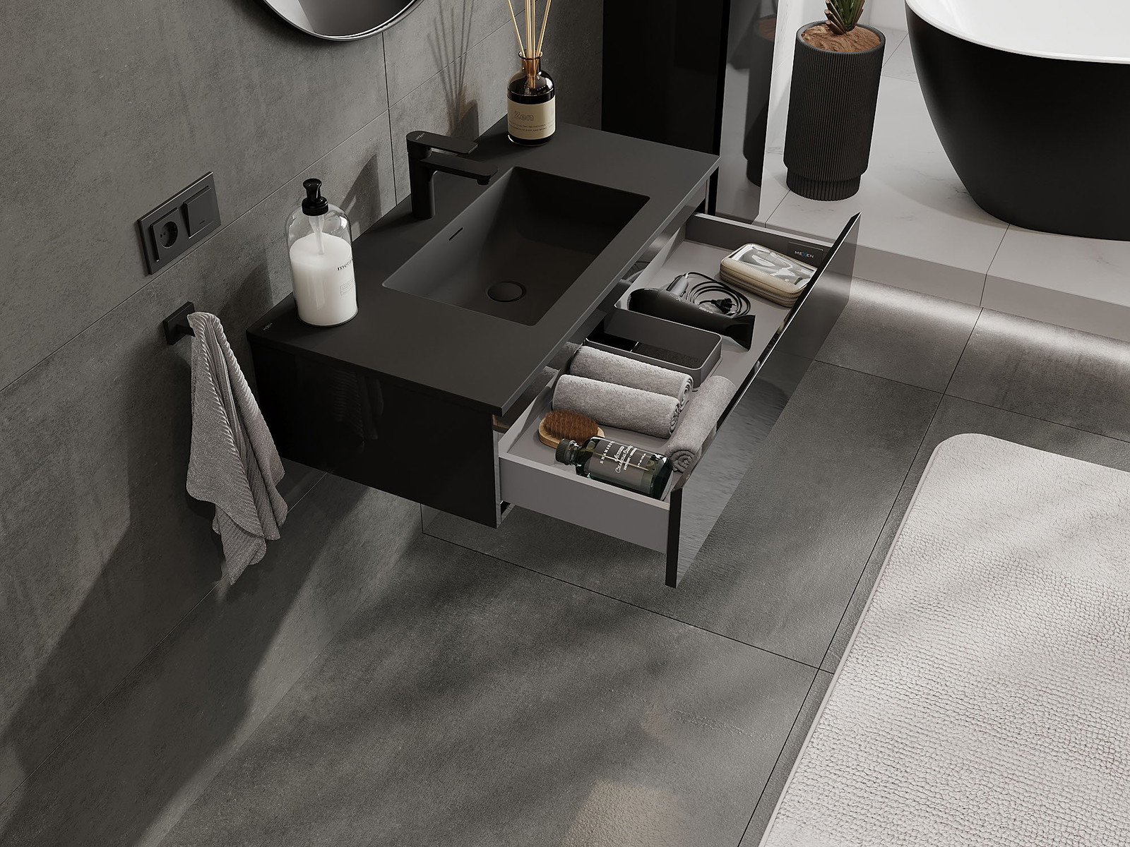 Mexen Orio armario de baño de 90 cm con lavabo Otis, 1 cajón, negro brillante/negro mate - 91A10-09023-1-BF70-W18M71