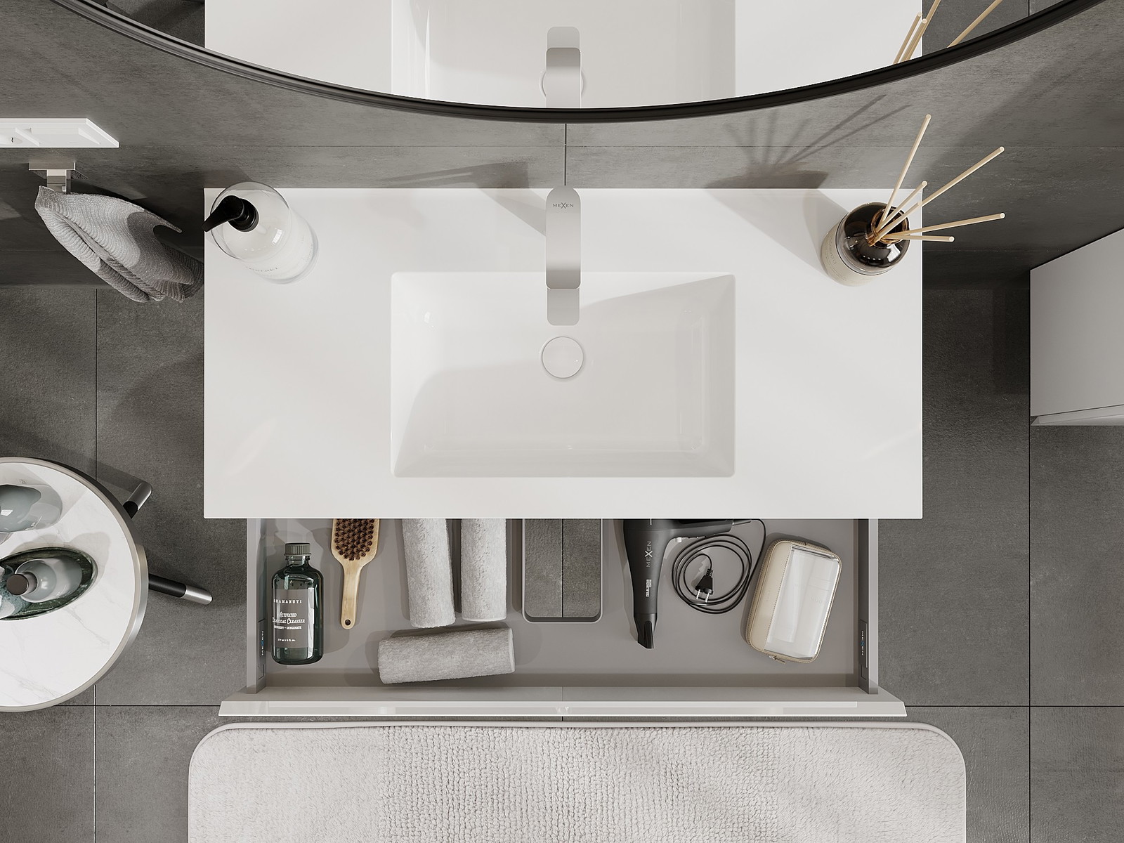 El corte en el cajón está diseñado de tal manera que pueda alojar el sifón, que es necesario en las instalaciones de lavabos. Gracias a esto, el mueble puede ser montado de manera completamente funcional, sin la necesidad de renunciar al espacio en el cajón en favor de la instalación.