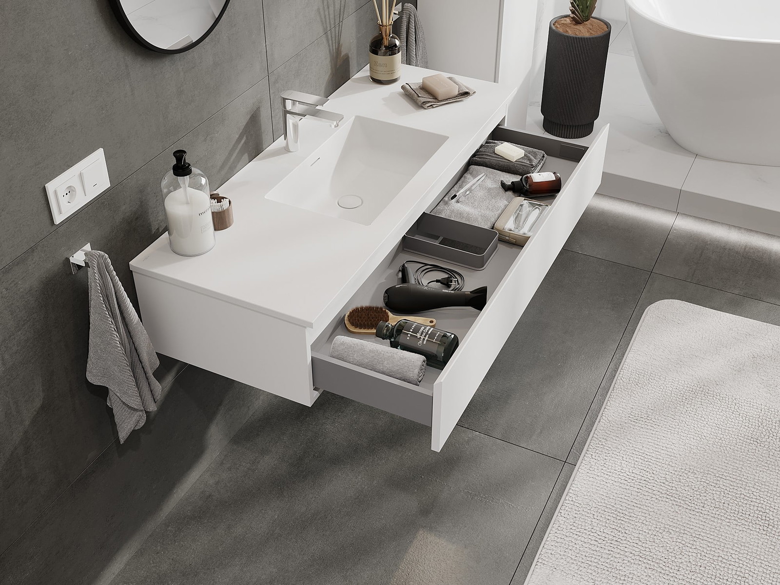 Nuestros muebles de baño modulares se pueden combinar en diferentes configuraciones de color, lo que permite una personalización completa. Se puede elegir tanto el aspecto como las funciones de los distintos elementos, lo que permite adaptar los muebles a las propias preferencias estilísticas y de uso.