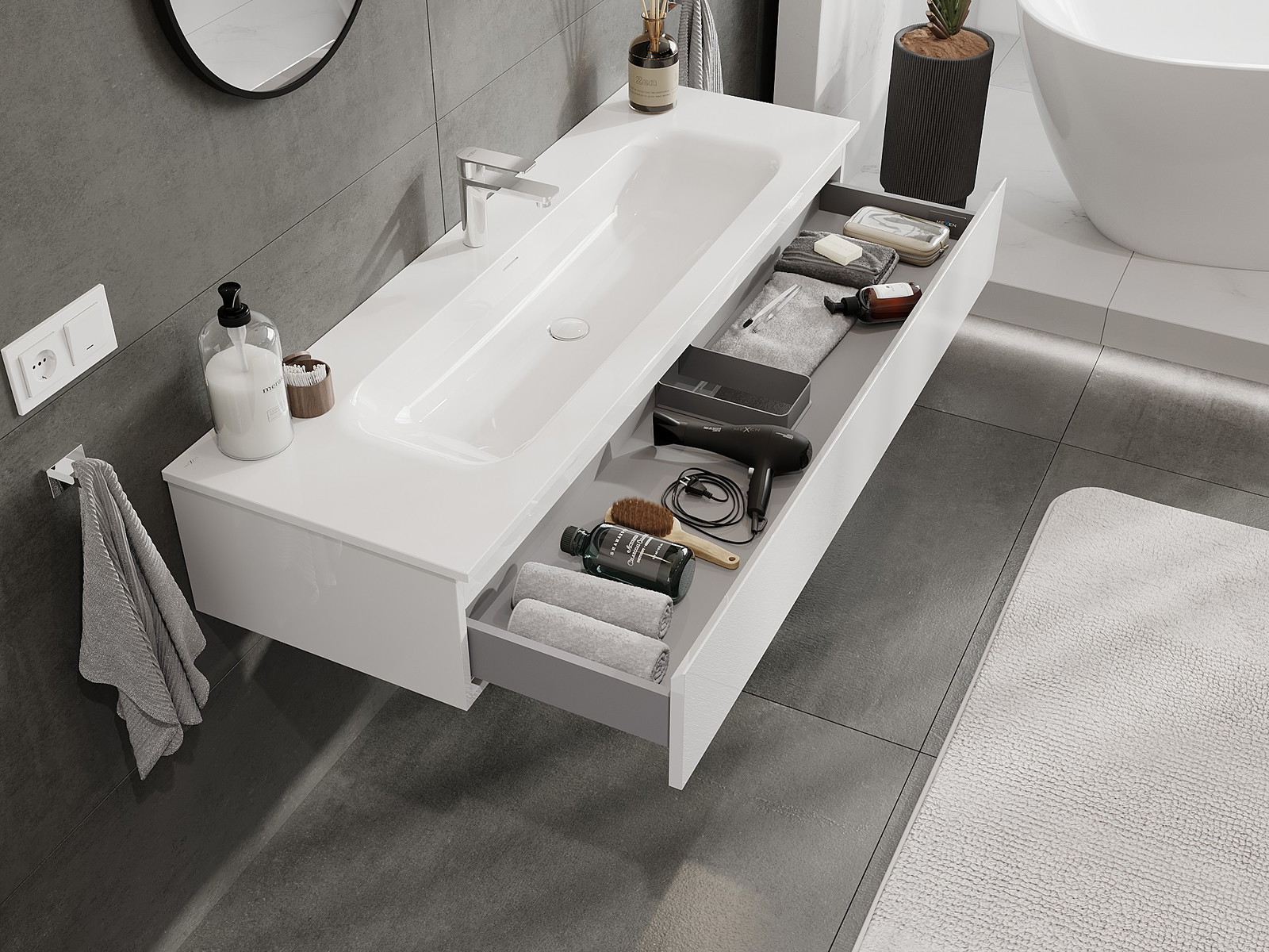 Nuestros muebles de baño modulares se pueden combinar en diferentes configuraciones de color, lo que permite una personalización completa. Se puede elegir tanto el aspecto como las funciones de los distintos elementos, lo que permite adaptar los muebles a las propias preferencias estilísticas y de uso.
