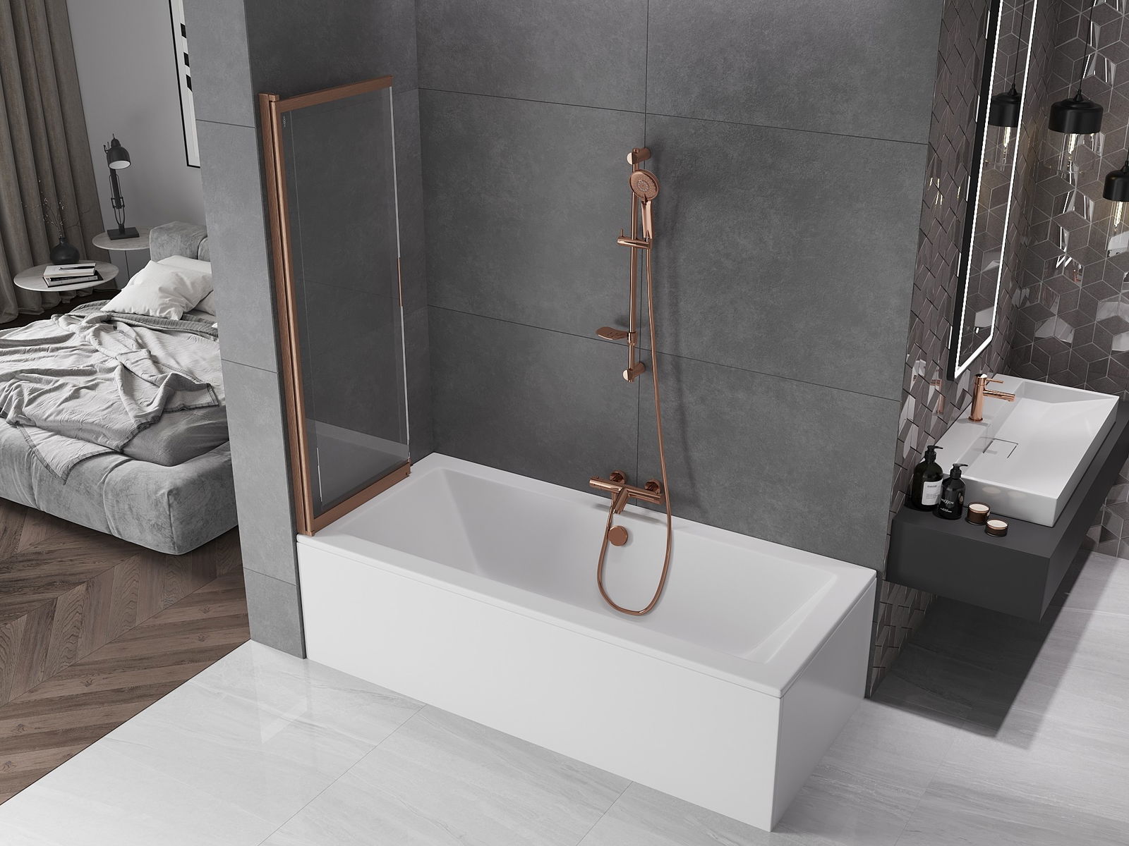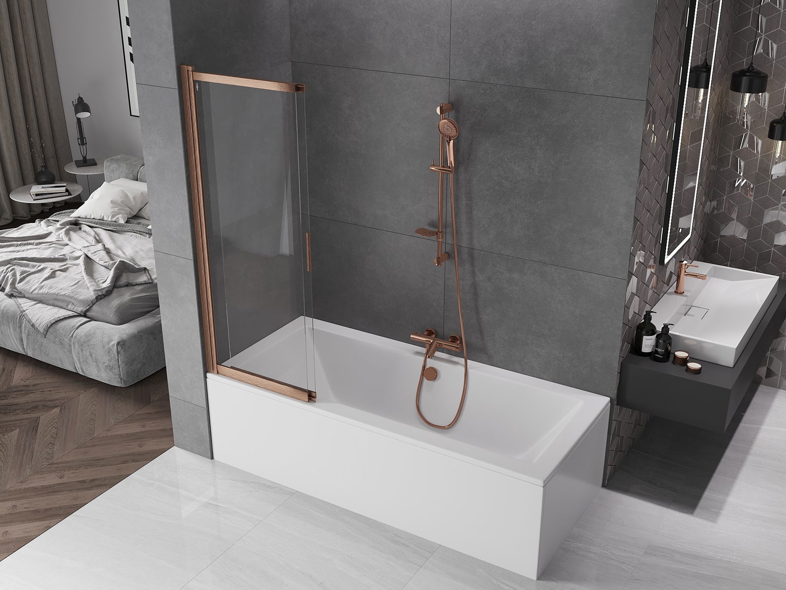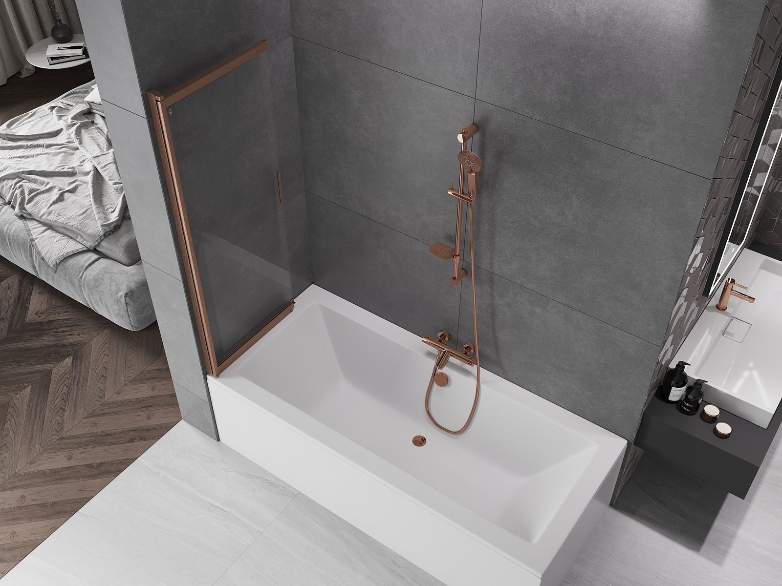Protección efectiva contra el derrame de agua durante el baño. La mampara tiene juntas que se ajustan perfectamente a la superficie del vidrio y al borde de la bañera. Solución funcional que garantiza seguridad y facilidad de limpieza.