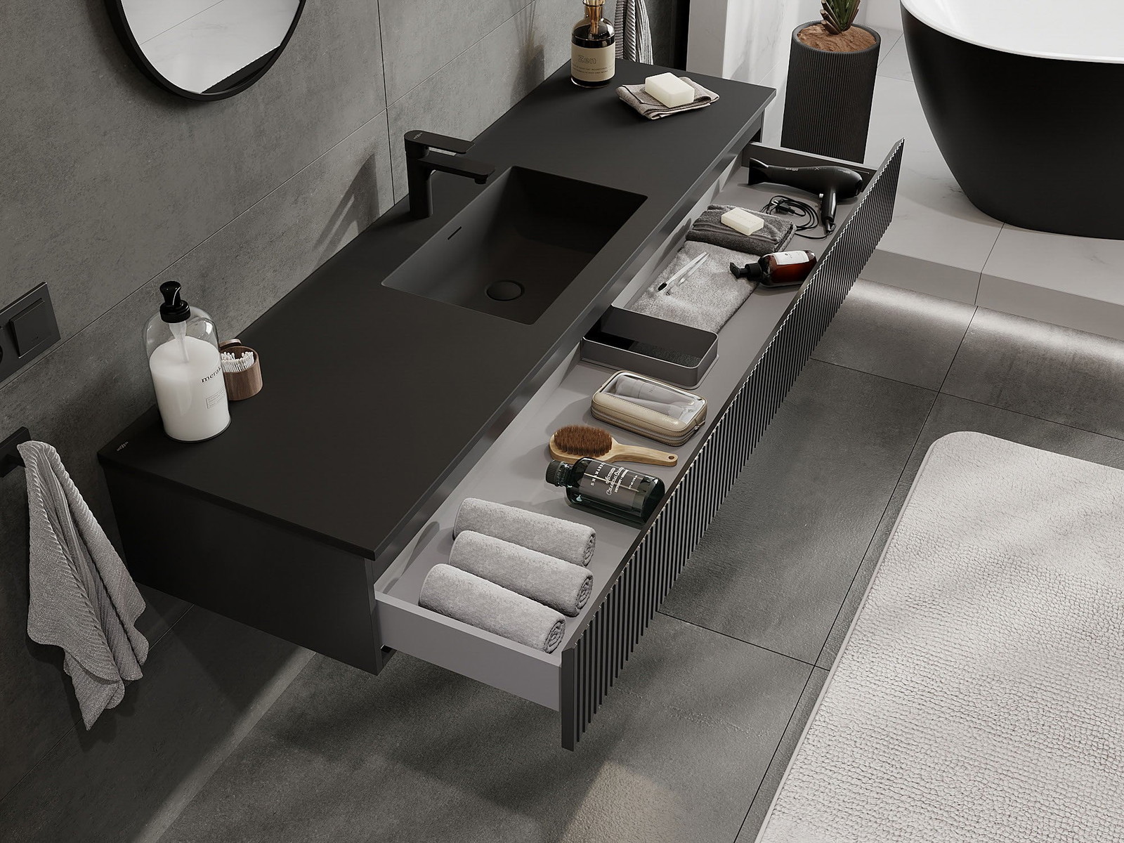 Mexen Rivel mueble de baño de 160 cm con lavabo Otis, 1 cajón, estriado, negro mate - 91A20-16023-1-BF71-W18M71