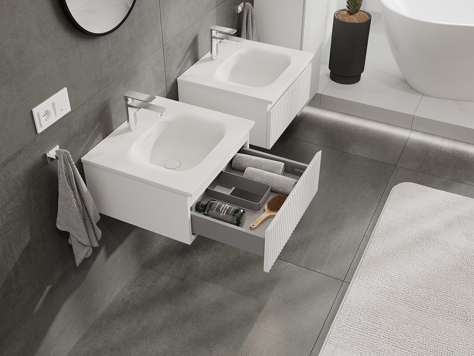 Nuestros muebles de baño modulares se pueden combinar en diferentes configuraciones de color, lo que permite una personalización completa. Se puede elegir tanto el aspecto como las funciones de los distintos elementos, lo que permite adaptar los muebles a las propias preferencias estilísticas y de uso.