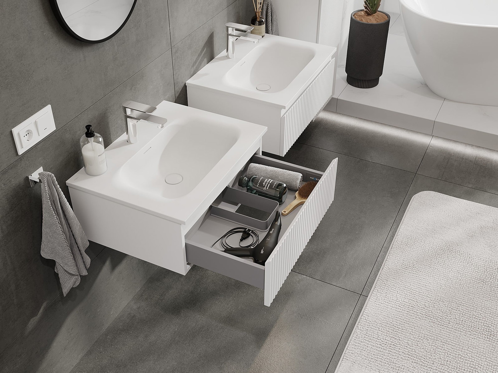 El cuerpo del gabinete se entrega completamente ensamblado, lo que significa máxima comodidad y ahorro de tiempo. No tienes que pasar horas ensamblando el mueble, solo necesitas instalarlo en el lugar elegido en el baño. Es la solución ideal para personas que valoran un montaje rápido y un efecto inmediato.