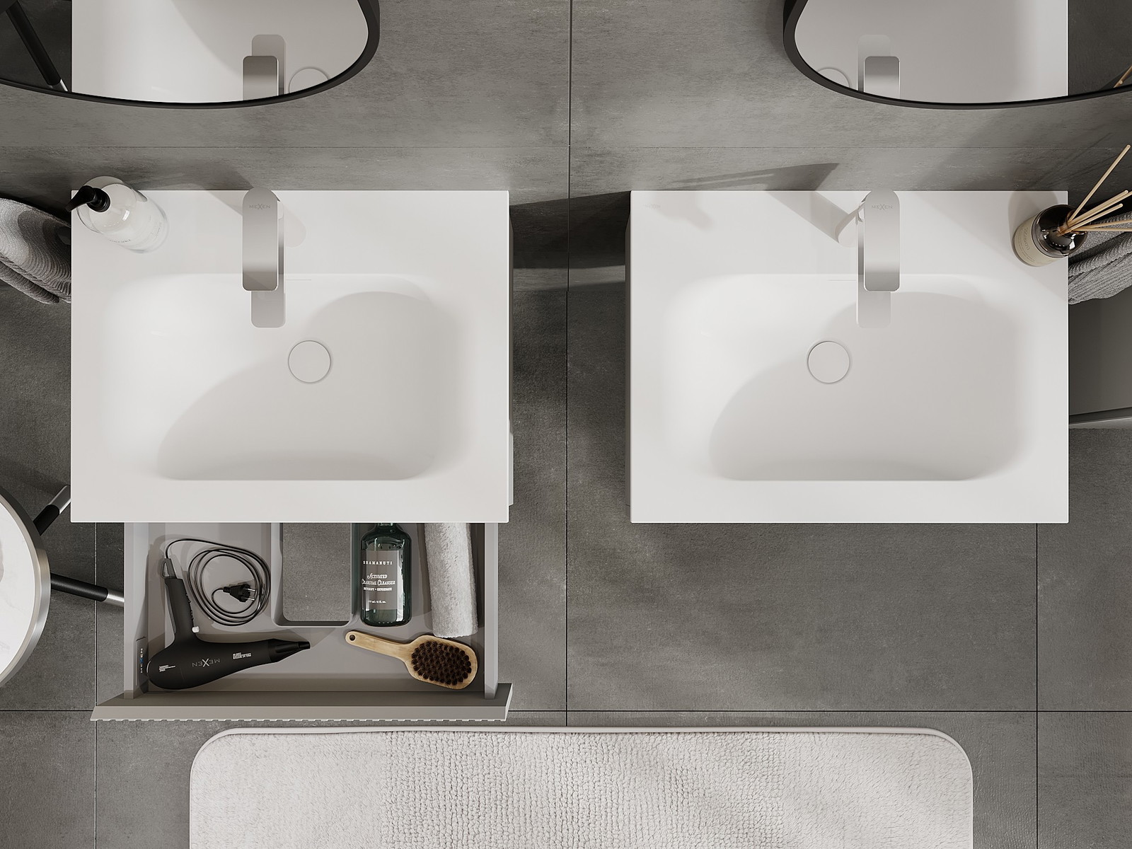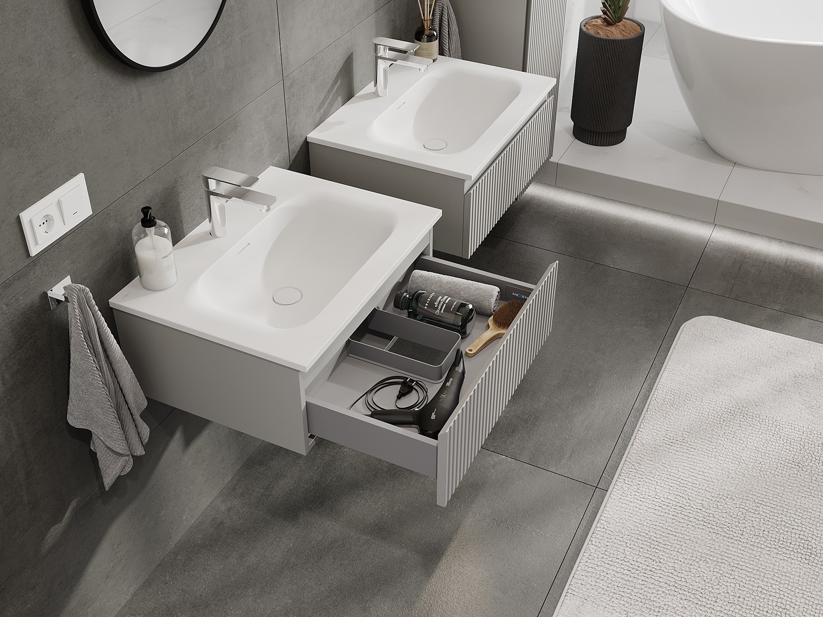 Nuestros muebles de baño modulares se pueden combinar en diferentes configuraciones de color, lo que permite una personalización completa. Se puede elegir tanto el aspecto como las funciones de los distintos elementos, lo que permite adaptar los muebles a las propias preferencias estilísticas y de uso.