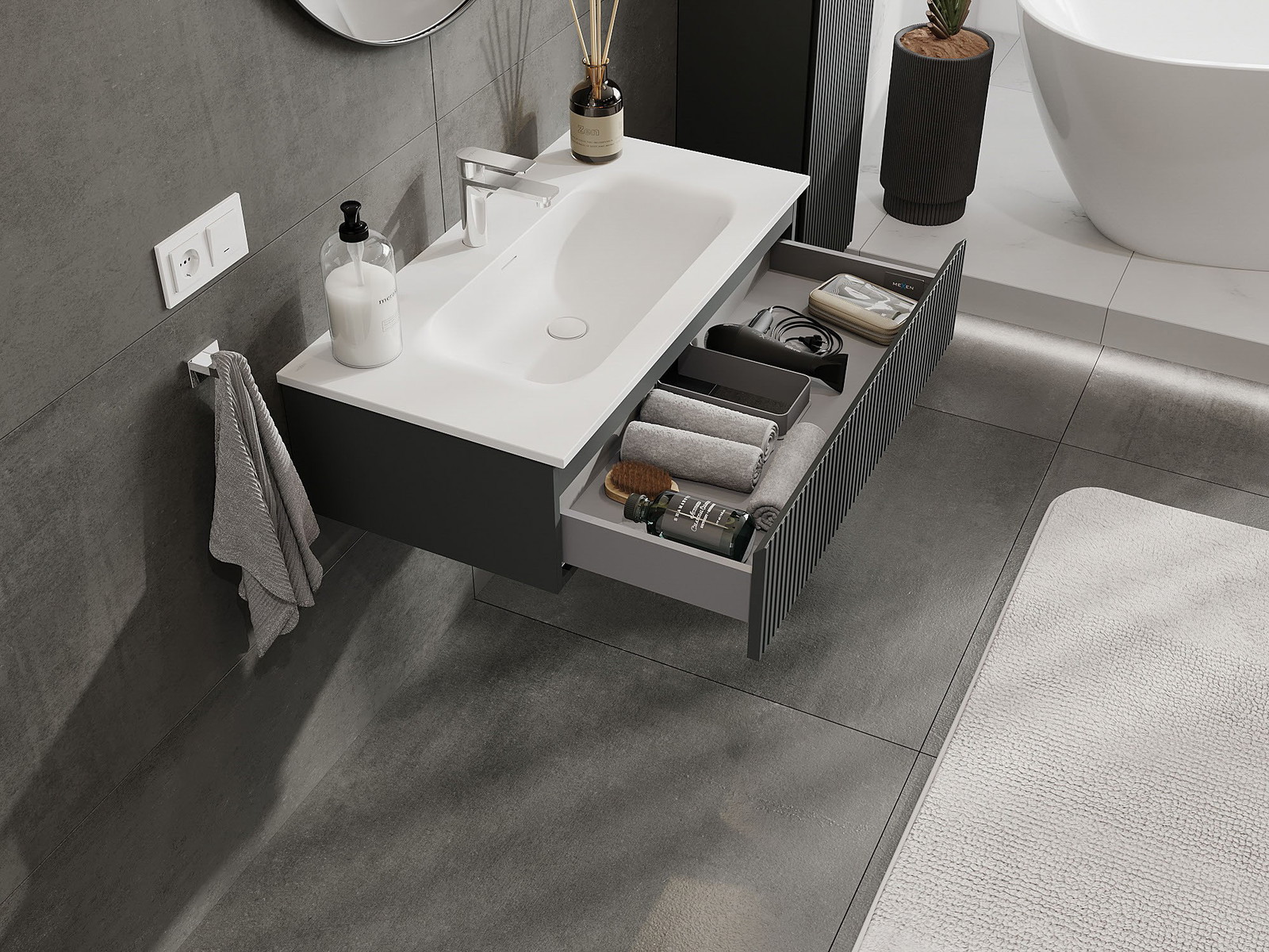 Nuestros muebles de baño modulares se pueden combinar en diferentes configuraciones de color, lo que permite una personalización completa. Se puede elegir tanto el aspecto como las funciones de los distintos elementos, lo que permite adaptar los muebles a las propias preferencias estilísticas y de uso.