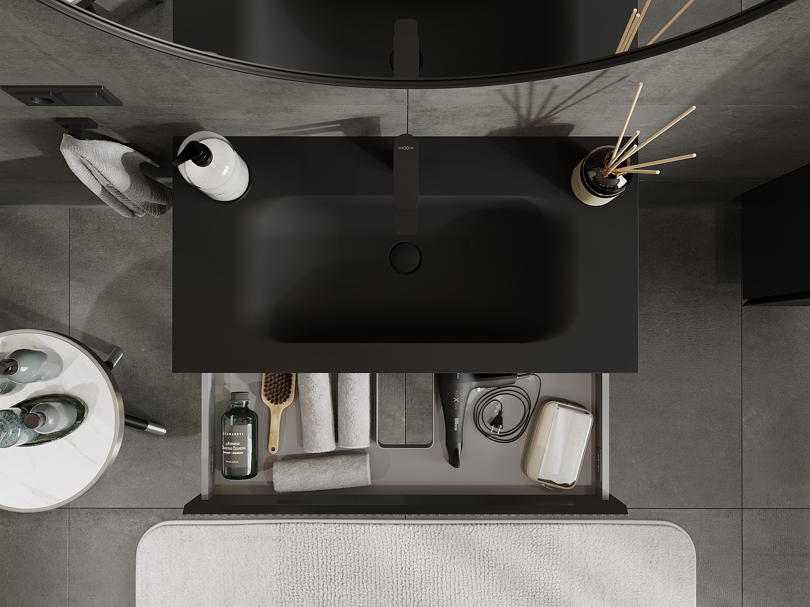 El corte en el cajón está diseñado de tal manera que pueda alojar el sifón, que es necesario en las instalaciones de lavabos. Gracias a esto, el mueble puede ser montado de manera completamente funcional, sin la necesidad de renunciar al espacio en el cajón en favor de la instalación.