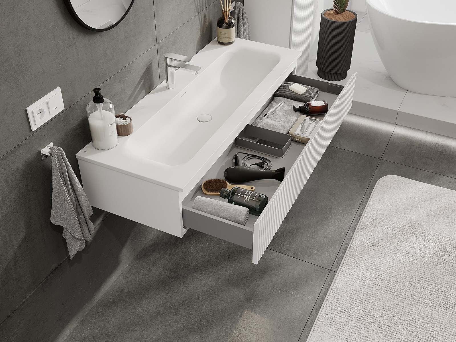 Nuestros muebles de baño modulares se pueden combinar en diferentes configuraciones de color, lo que permite una personalización completa. Se puede elegir tanto el aspecto como las funciones de los distintos elementos, lo que permite adaptar los muebles a las propias preferencias estilísticas y de uso.