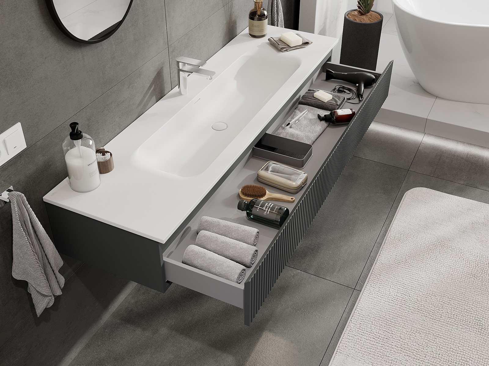 Nuestros muebles de baño modulares se pueden combinar en diferentes configuraciones de color, lo que permite una personalización completa. Se puede elegir tanto el aspecto como las funciones de los distintos elementos, lo que permite adaptar los muebles a las propias preferencias estilísticas y de uso.