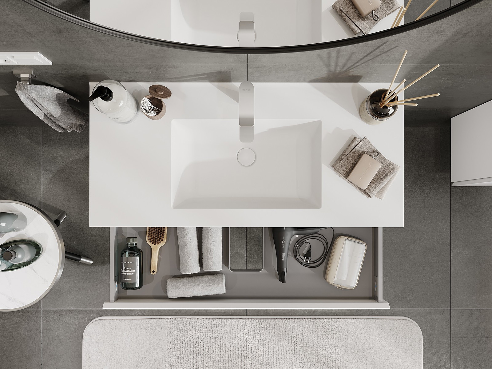 Nuestros muebles de baño modulares se pueden combinar en diferentes configuraciones de color, lo que permite una personalización completa. Se puede elegir tanto el aspecto como las funciones de los distintos elementos, lo que permite adaptar los muebles a las propias preferencias estilísticas y de uso.