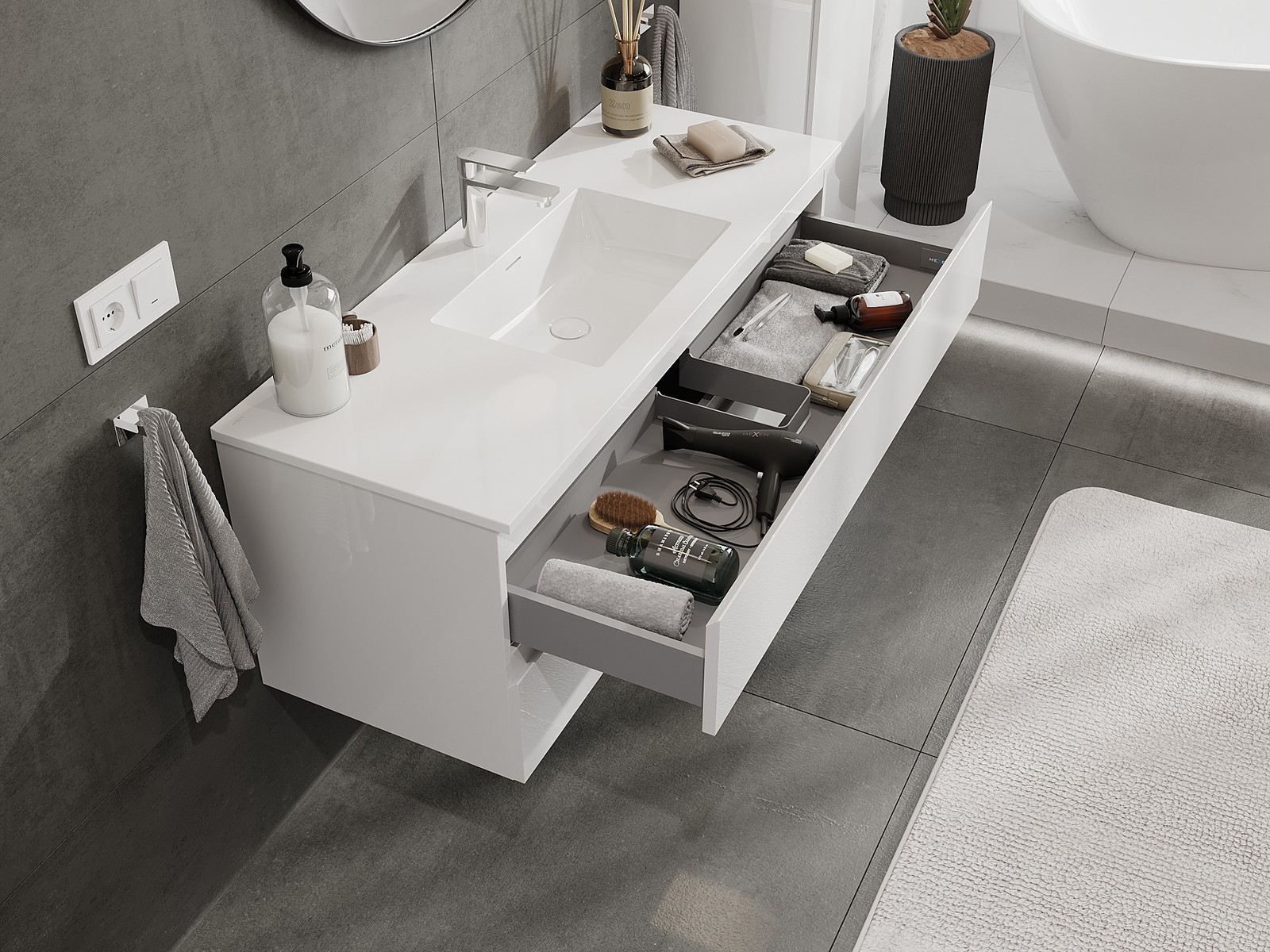 El corte en el cajón está diseñado de tal manera que pueda alojar el sifón, que es necesario en las instalaciones de lavabos. Gracias a esto, el mueble puede ser montado de manera completamente funcional, sin la necesidad de renunciar al espacio en el cajón en favor de la instalación.