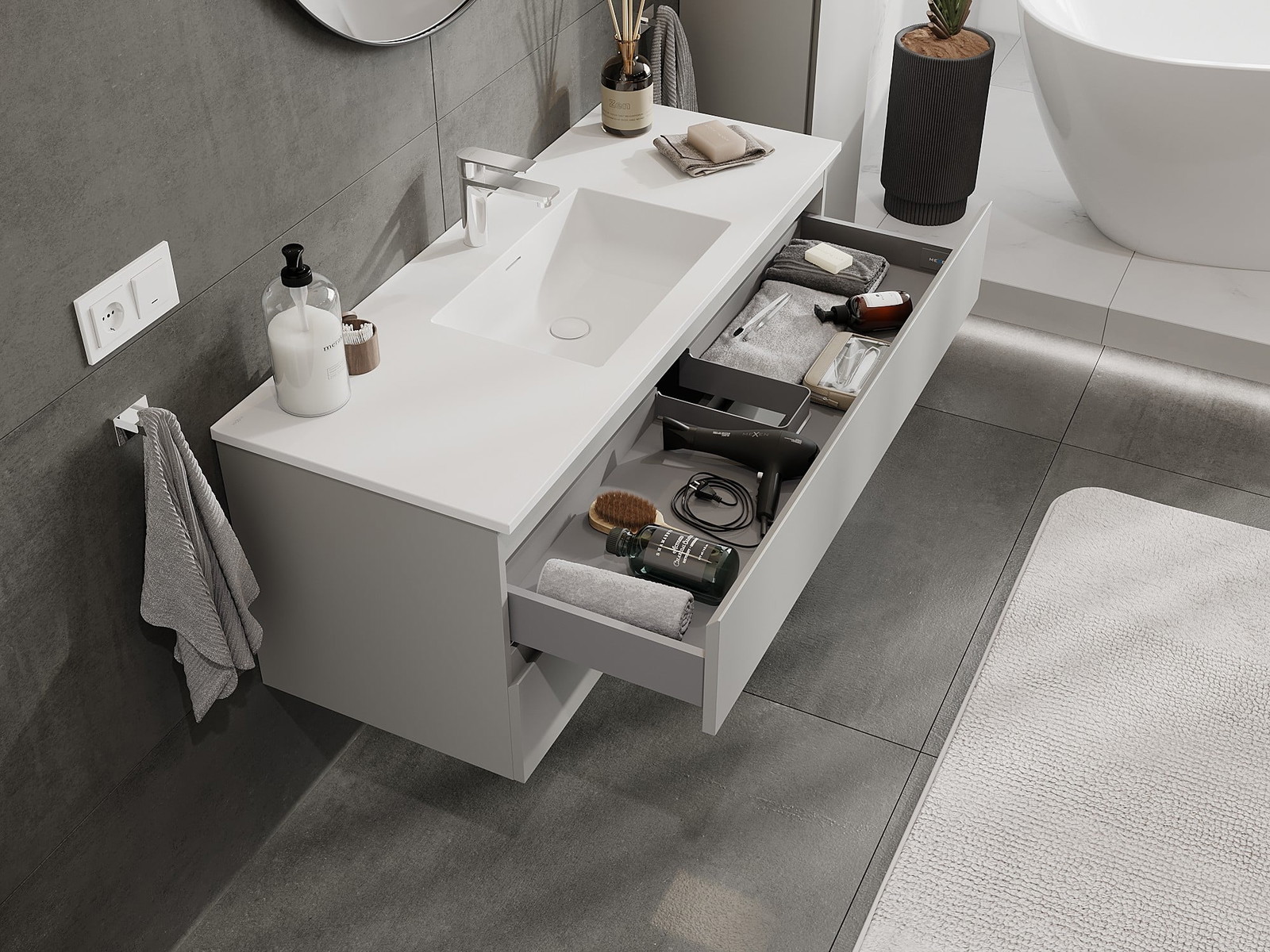 Nuestros muebles de baño modulares se pueden combinar en diferentes configuraciones de color, lo que permite una personalización completa. Se puede elegir tanto el aspecto como las funciones de los distintos elementos, lo que permite adaptar los muebles a las propias preferencias estilísticas y de uso.