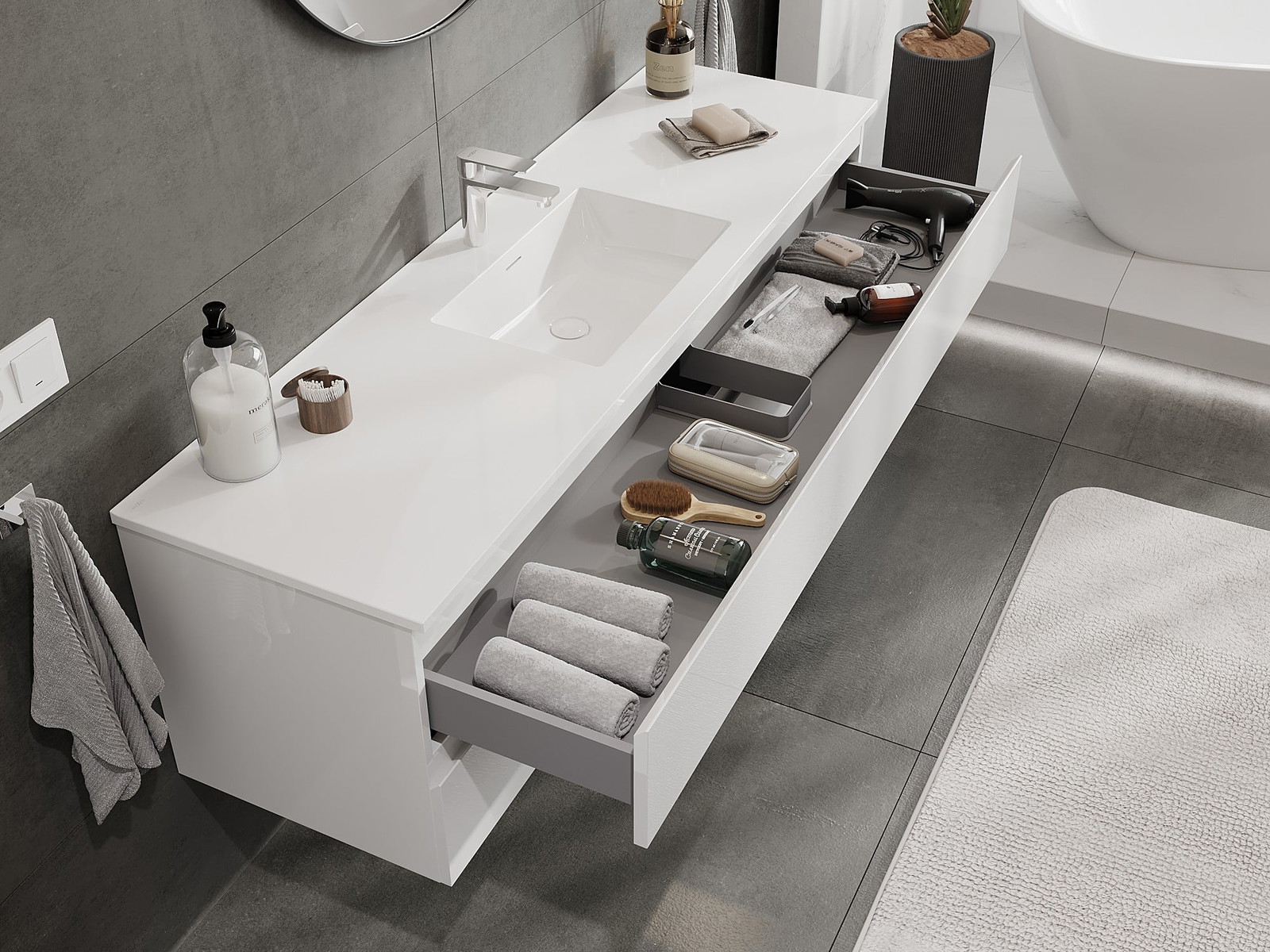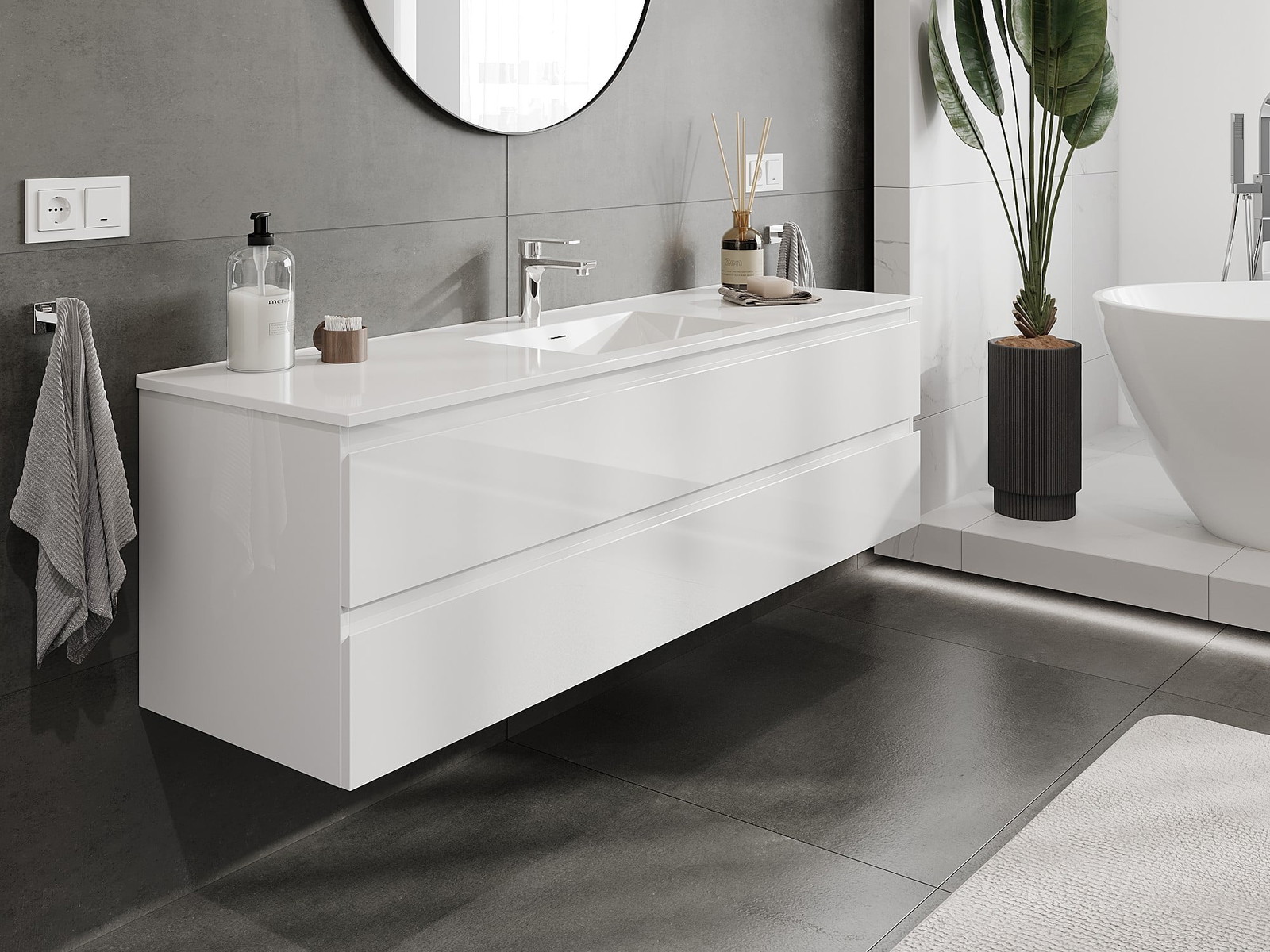 Nuestros muebles de baño modulares se pueden combinar en diferentes configuraciones de color, lo que permite una personalización completa. Se puede elegir tanto el aspecto como las funciones de los distintos elementos, lo que permite adaptar los muebles a las propias preferencias estilísticas y de uso.