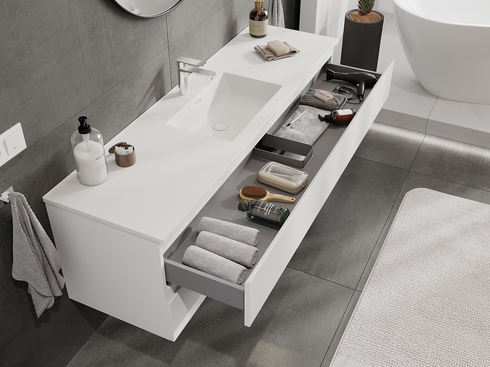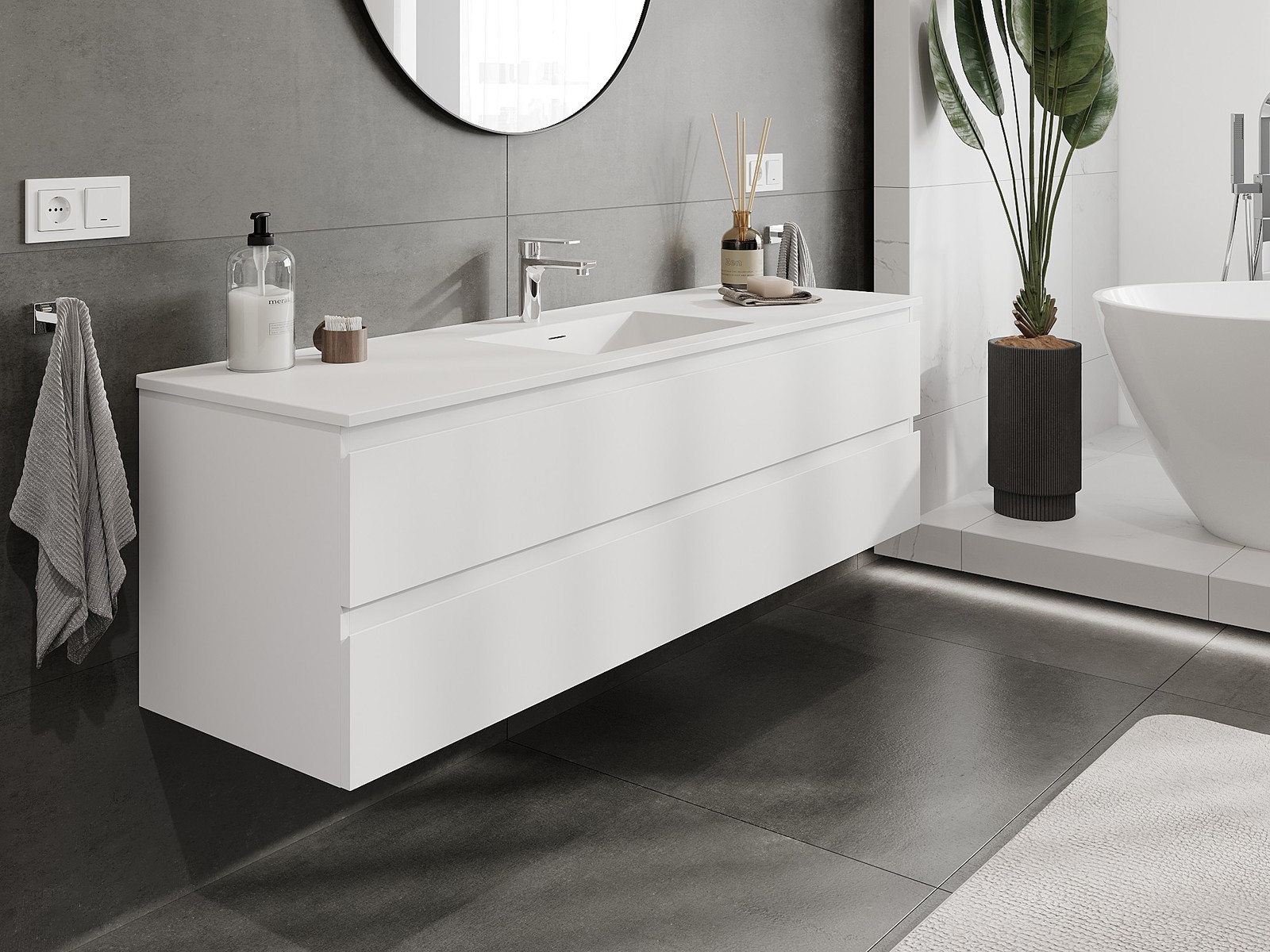 Nuestros muebles de baño modulares se pueden combinar en diferentes configuraciones de color, lo que permite una personalización completa. Se puede elegir tanto el aspecto como las funciones de los distintos elementos, lo que permite adaptar los muebles a las propias preferencias estilísticas y de uso.