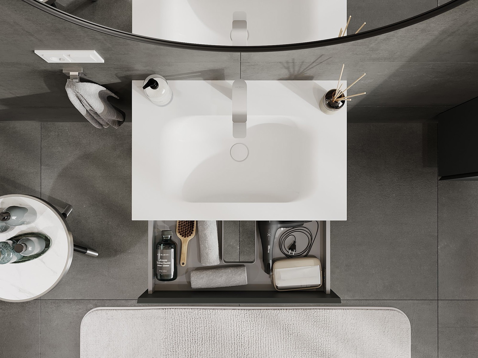 El corte en el cajón está diseñado de tal manera que pueda alojar el sifón, que es necesario en las instalaciones de lavabos. Gracias a esto, el mueble puede ser montado de manera completamente funcional, sin la necesidad de renunciar al espacio en el cajón en favor de la instalación.