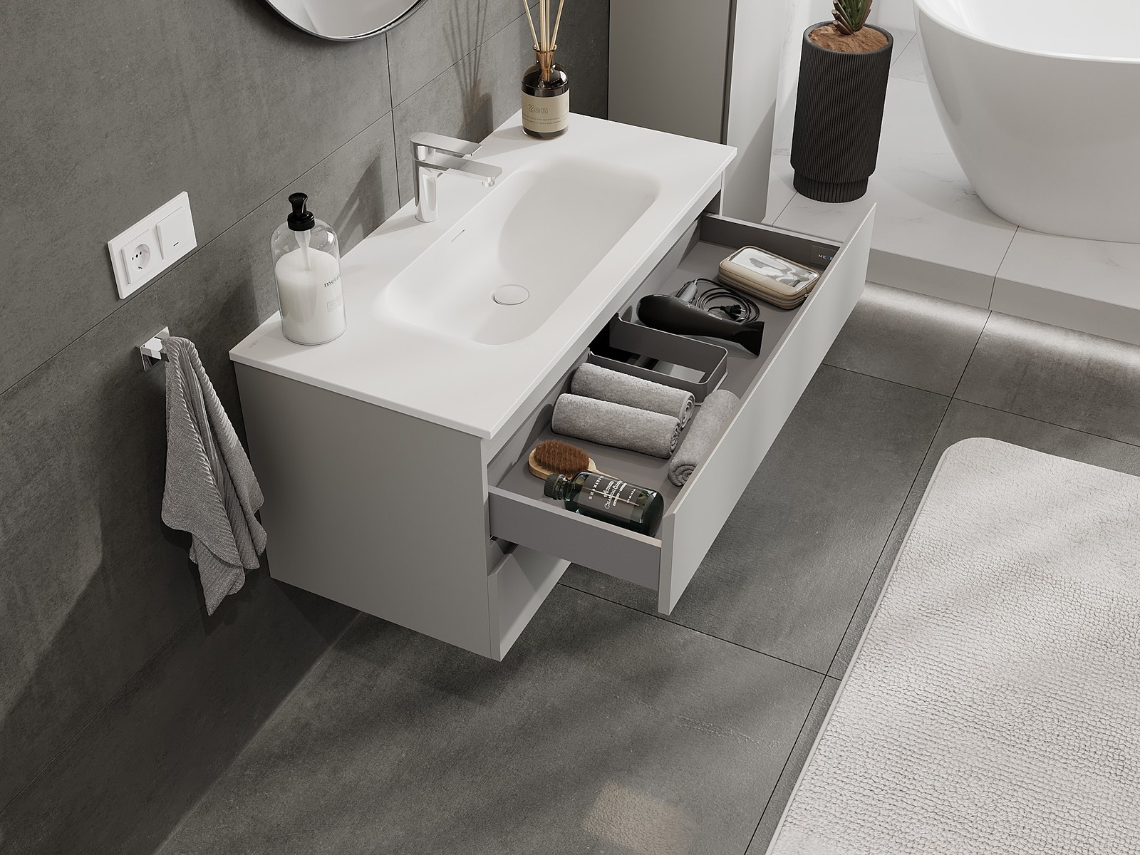 Nuestros muebles de baño modulares se pueden combinar en diferentes configuraciones de color, lo que permite una personalización completa. Se puede elegir tanto el aspecto como las funciones de los distintos elementos, lo que permite adaptar los muebles a las propias preferencias estilísticas y de uso.