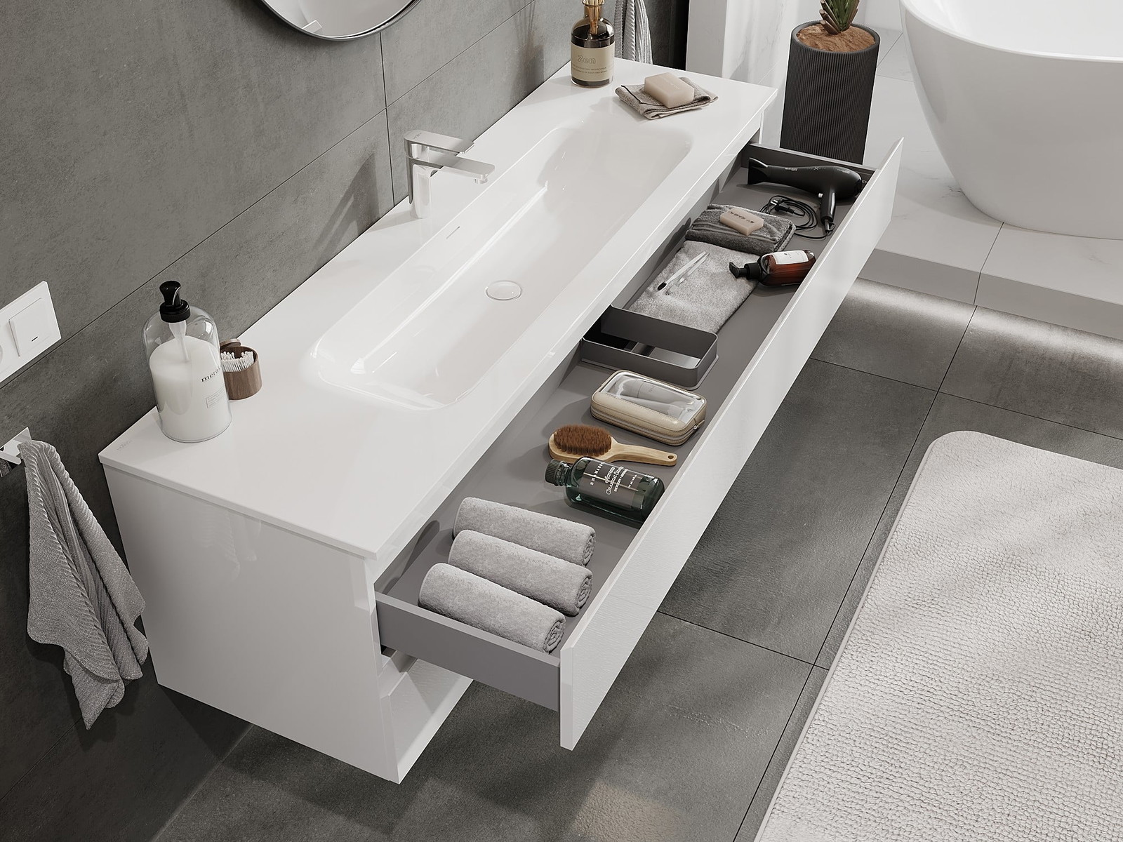 Nuestros muebles de baño modulares se pueden combinar en diferentes configuraciones de color, lo que permite una personalización completa. Se puede elegir tanto el aspecto como las funciones de los distintos elementos, lo que permite adaptar los muebles a las propias preferencias estilísticas y de uso.