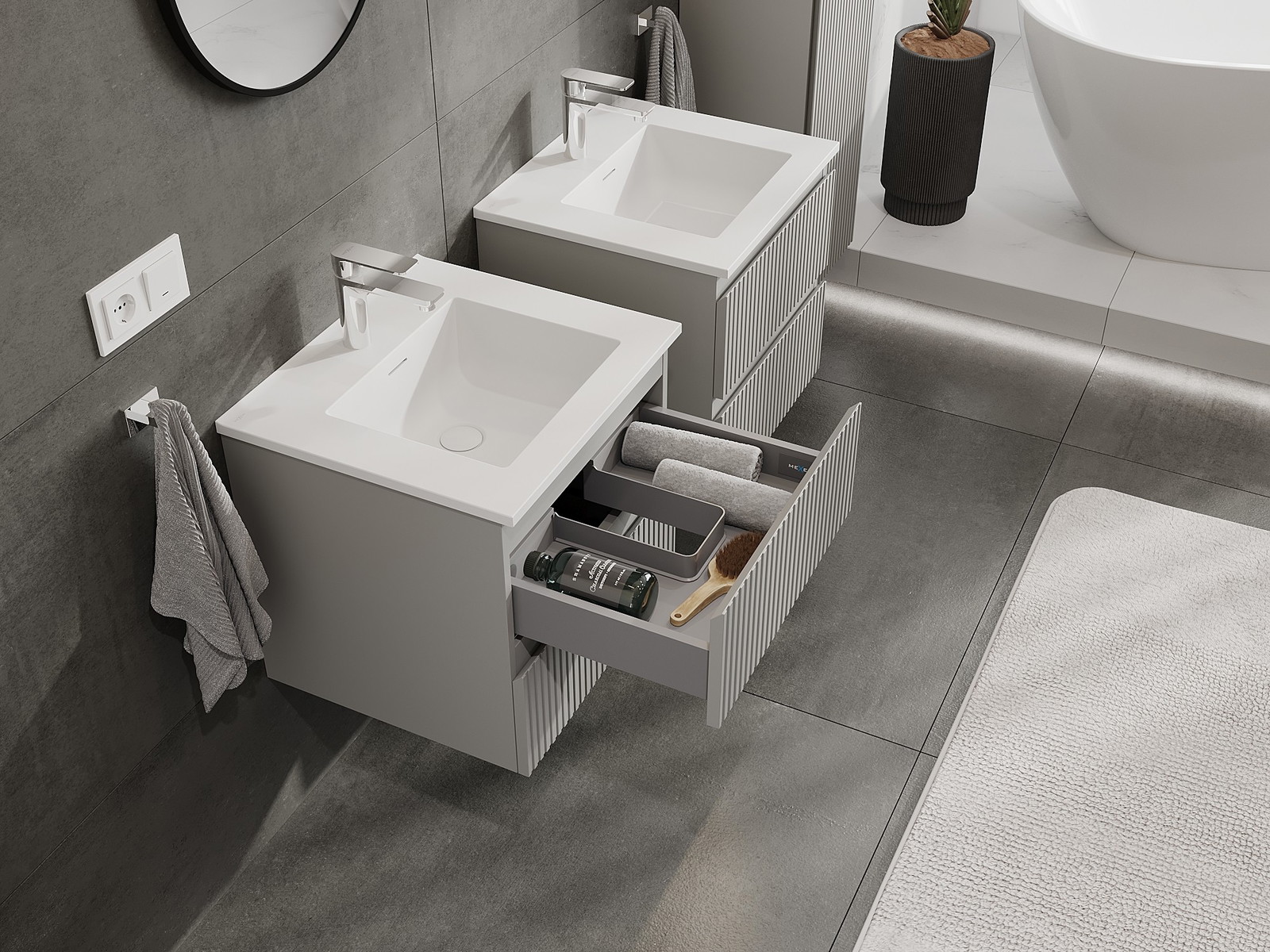 Nuestros muebles de baño modulares se pueden combinar en diferentes configuraciones de color, lo que permite una personalización completa. Se puede elegir tanto el aspecto como las funciones de los distintos elementos, lo que permite adaptar los muebles a las propias preferencias estilísticas y de uso.