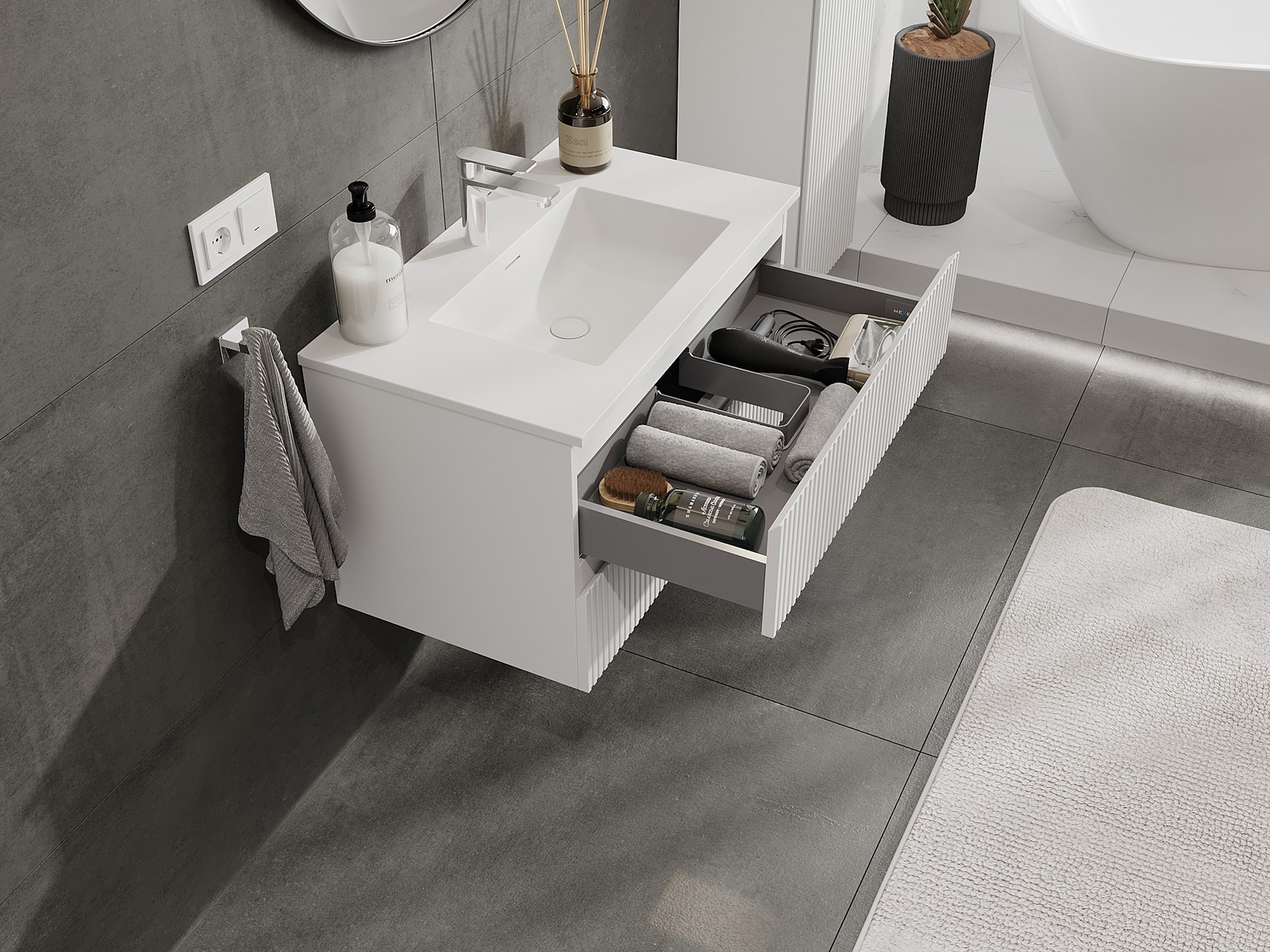 Nuestros muebles de baño modulares se pueden combinar en diferentes configuraciones de color, lo que permite una personalización completa. Se puede elegir tanto el aspecto como las funciones de los distintos elementos, lo que permite adaptar los muebles a las propias preferencias estilísticas y de uso.
