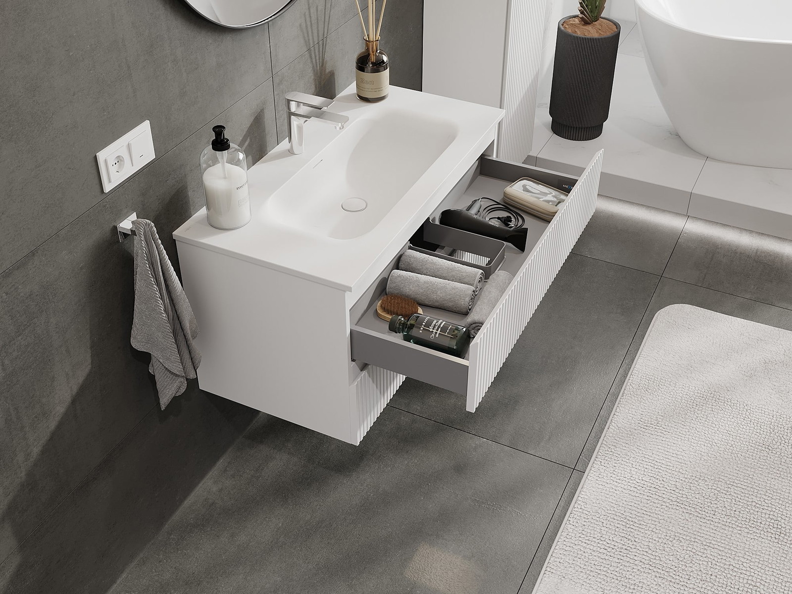 Nuestros muebles de baño modulares se pueden combinar en diferentes configuraciones de color, lo que permite una personalización completa. Se puede elegir tanto el aspecto como las funciones de los distintos elementos, lo que permite adaptar los muebles a las propias preferencias estilísticas y de uso.