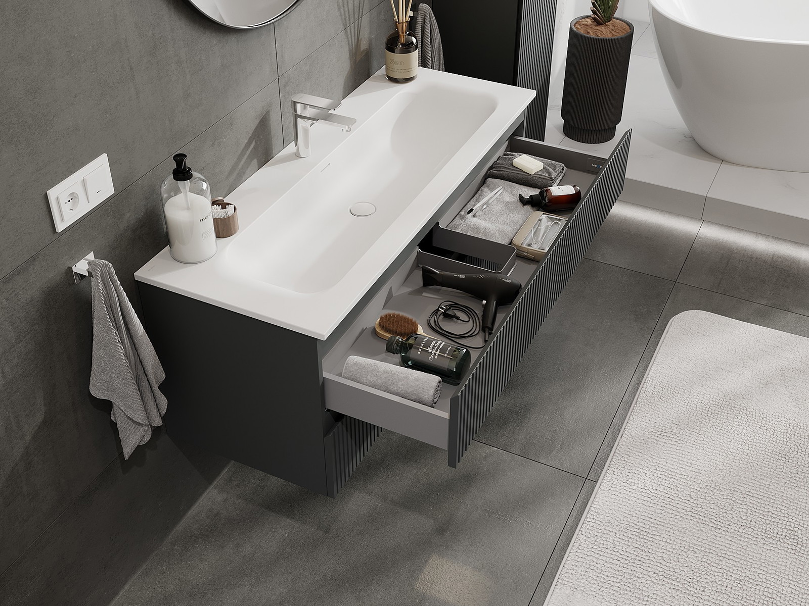 Nuestros muebles de baño modulares se pueden combinar en diferentes configuraciones de color, lo que permite una personalización completa. Se puede elegir tanto el aspecto como las funciones de los distintos elementos, lo que permite adaptar los muebles a las propias preferencias estilísticas y de uso.